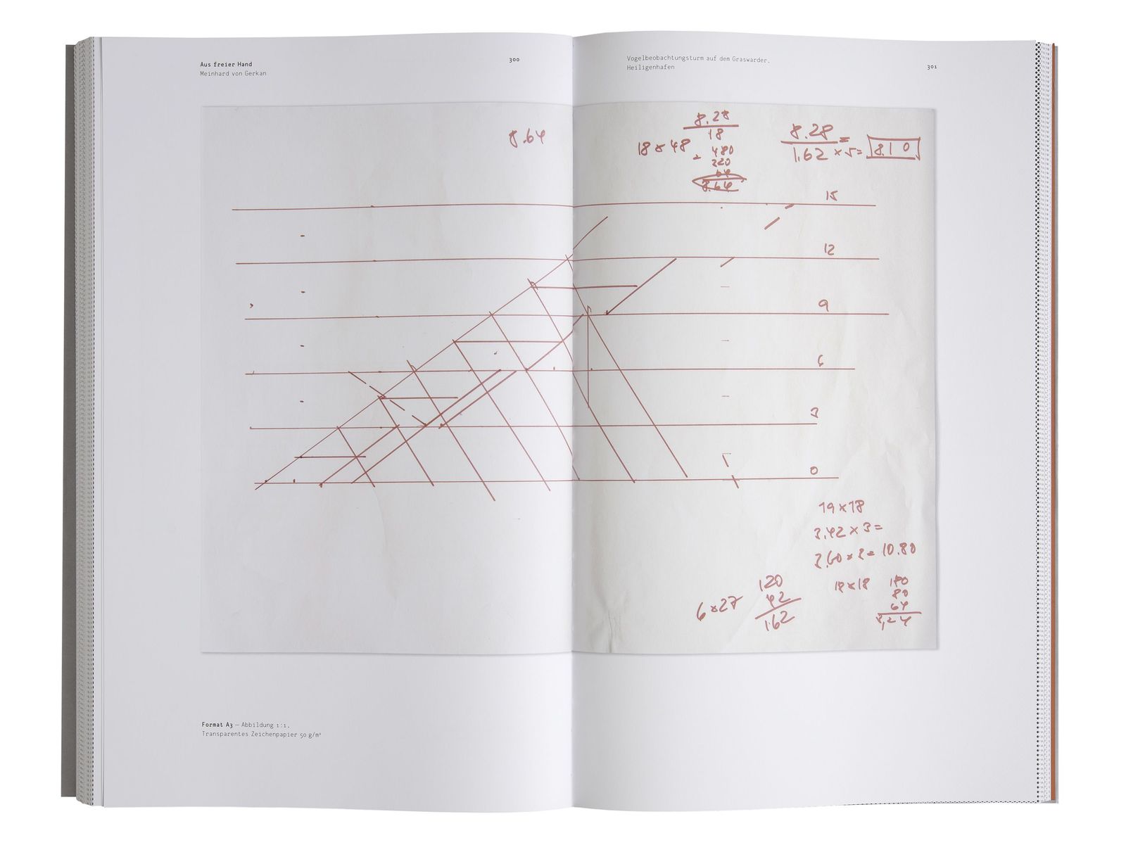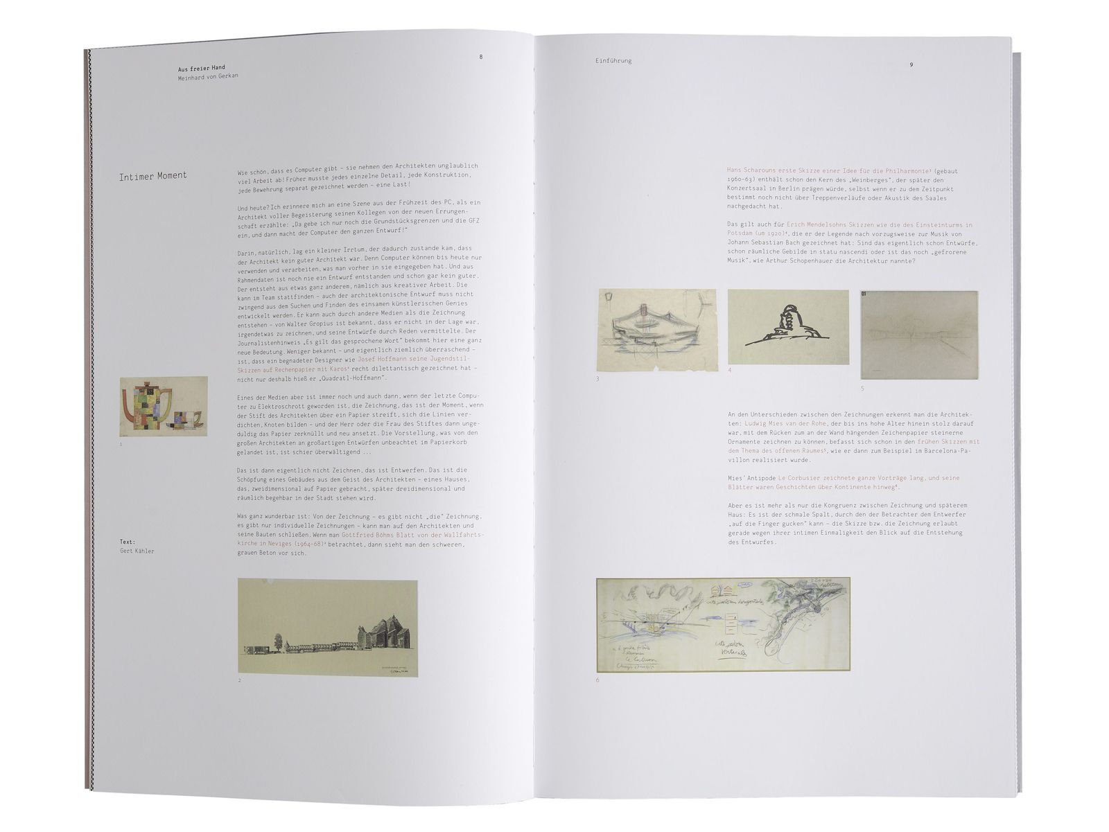 Der anlässlich der Ausstellung „Aus freier Hand“ zum 50-jährigen Bestehen des Büros erschienene Katalog gewährt anhand von 39 ausgewählten Projekten Einblick in das umfangreiche Skizzenarchiv Meinhard von Gerkans, der seine Entwürfe zeit seines Lebens in Skizzen entwickelt hat.