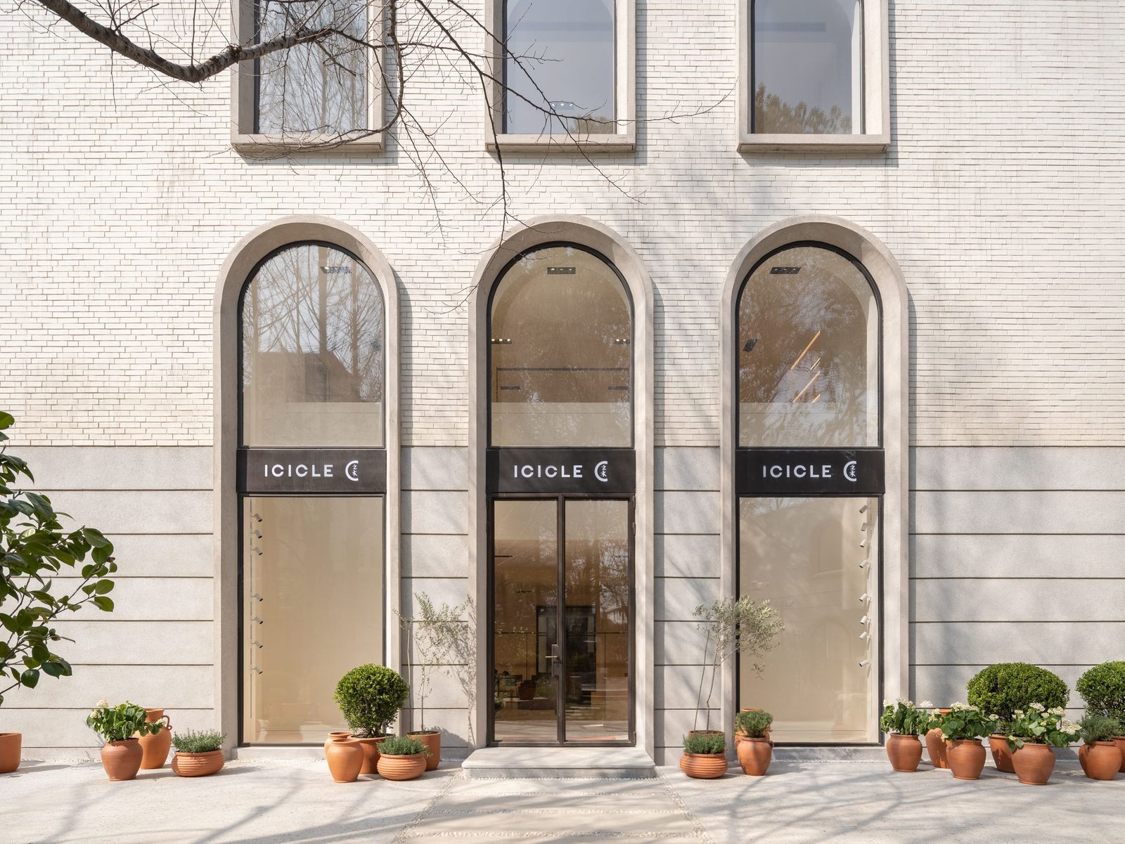 The concept for the two-story facade of the flagship store is based on ICICLE’s philosophy – “Made in Earth”. A curtain of 800 tubes extends across the facade, handcrafted using traditional techniques in Jingdezhen, the center of Chinese porcelain production since the Ming Dynasty. These tubes consist of pure white porcelain with a satin glaze. Subtle irregularities in their shape and glaze are evidence of the craftsmanship. The architects have chosen ceramics, a natural material, as the main element that forms a contrast to the dark gray metal profiles of the storefront. The overall concept emphasizes reduction, transparency, and material uniformity. The frame and structure of the shop facade are minimized as much as possible.