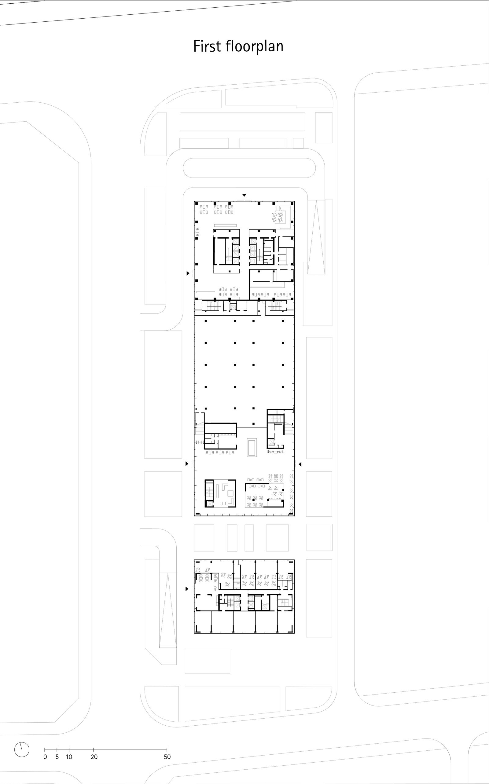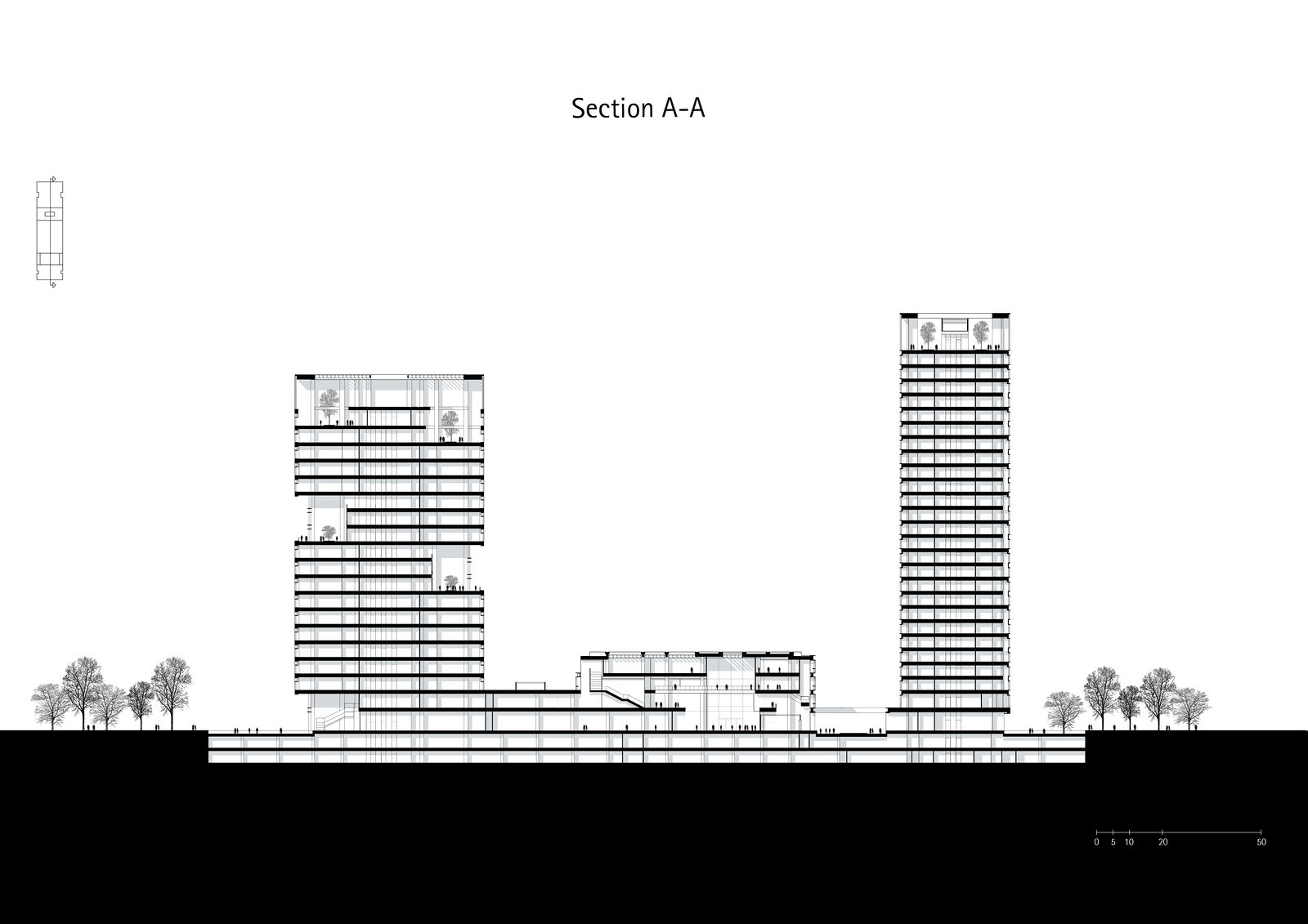 A continuous white aluminum façade band visually unifies the office tower, museum, and residential tower into a single ensemble. Large expanses of glass characterize all three buildings and emphasize the coherent architectural expression. At the same time, each façade is tailored to its respective function: the office tower’s glass surface gains depth through horizontal off-sets and vertical cut-outs that continue inside as two central sky lobbies; the museum’s transparent envelope underscores its public role; and the vertically articulated residential façade incorporates natural ventilation elements and technical systems. Terraces, generous lightwells, and a rooftop garden add further social and environmental value to the development.