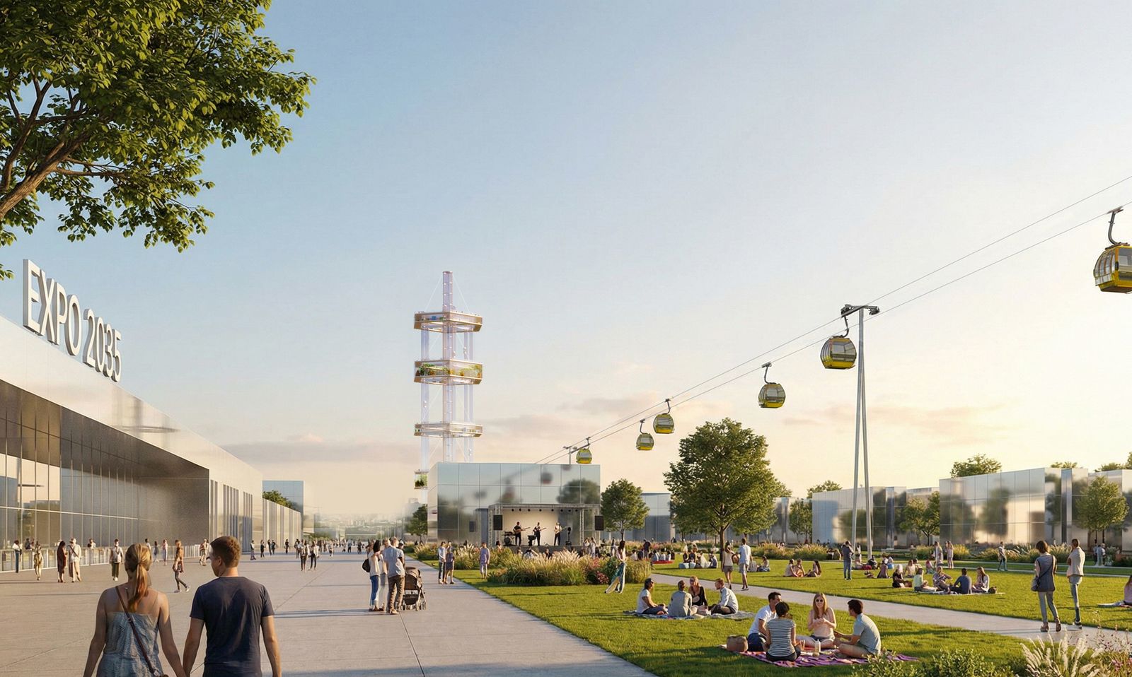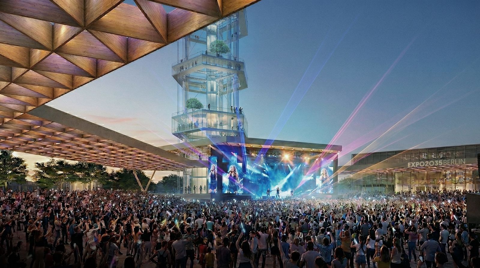 The studies draw on the triangular geometry defined by the airport building as the nucleus and derive from it geometric reference systems that link the campus area with the Kurt-Schumacher-Quartier to create vibrant urban spaces. The Expo Plaza emerges as the central connecting element of the World Expo. In the design, it is bordered by the Arena, the Germany Pavilion, and the Berlin Pavilion, while a slender observation tower with seemingly floating glass rings appears as the landmark of the Expo.