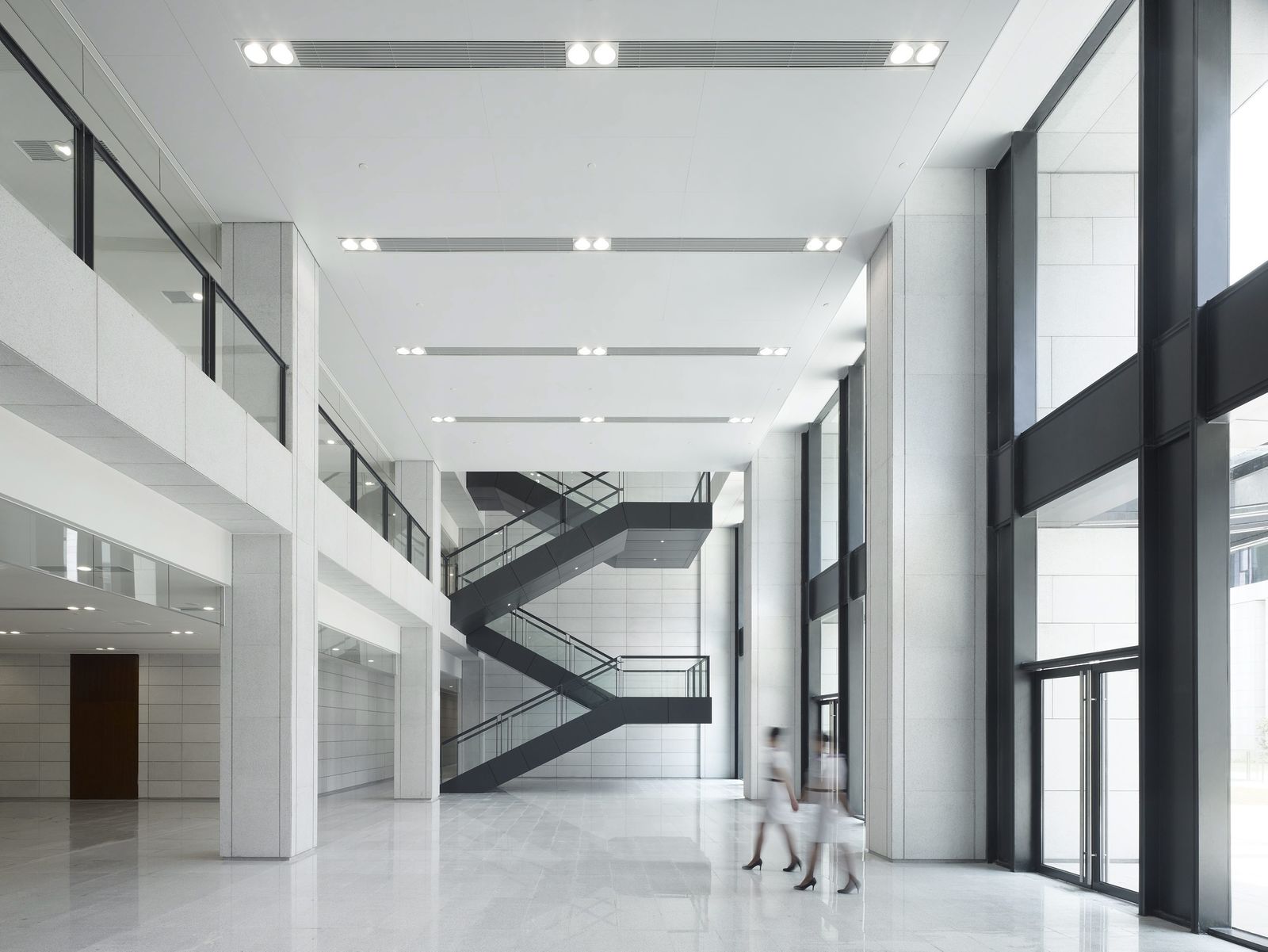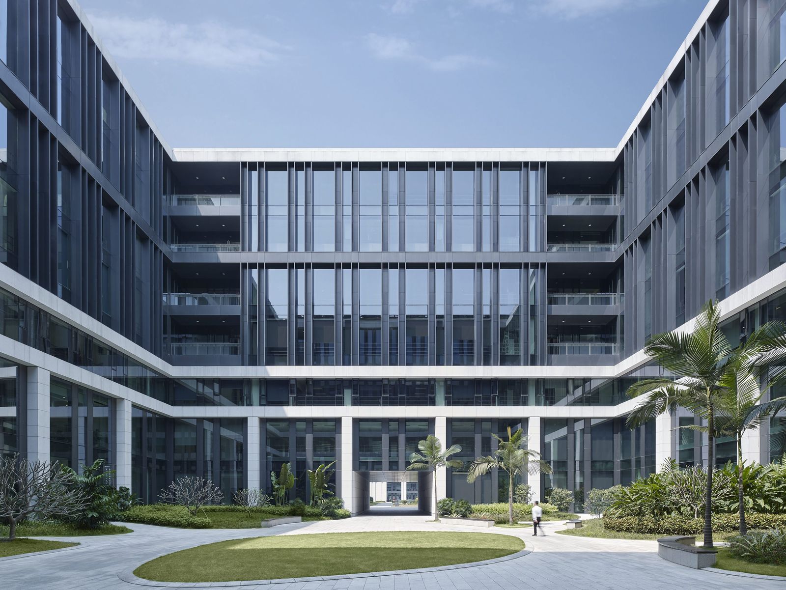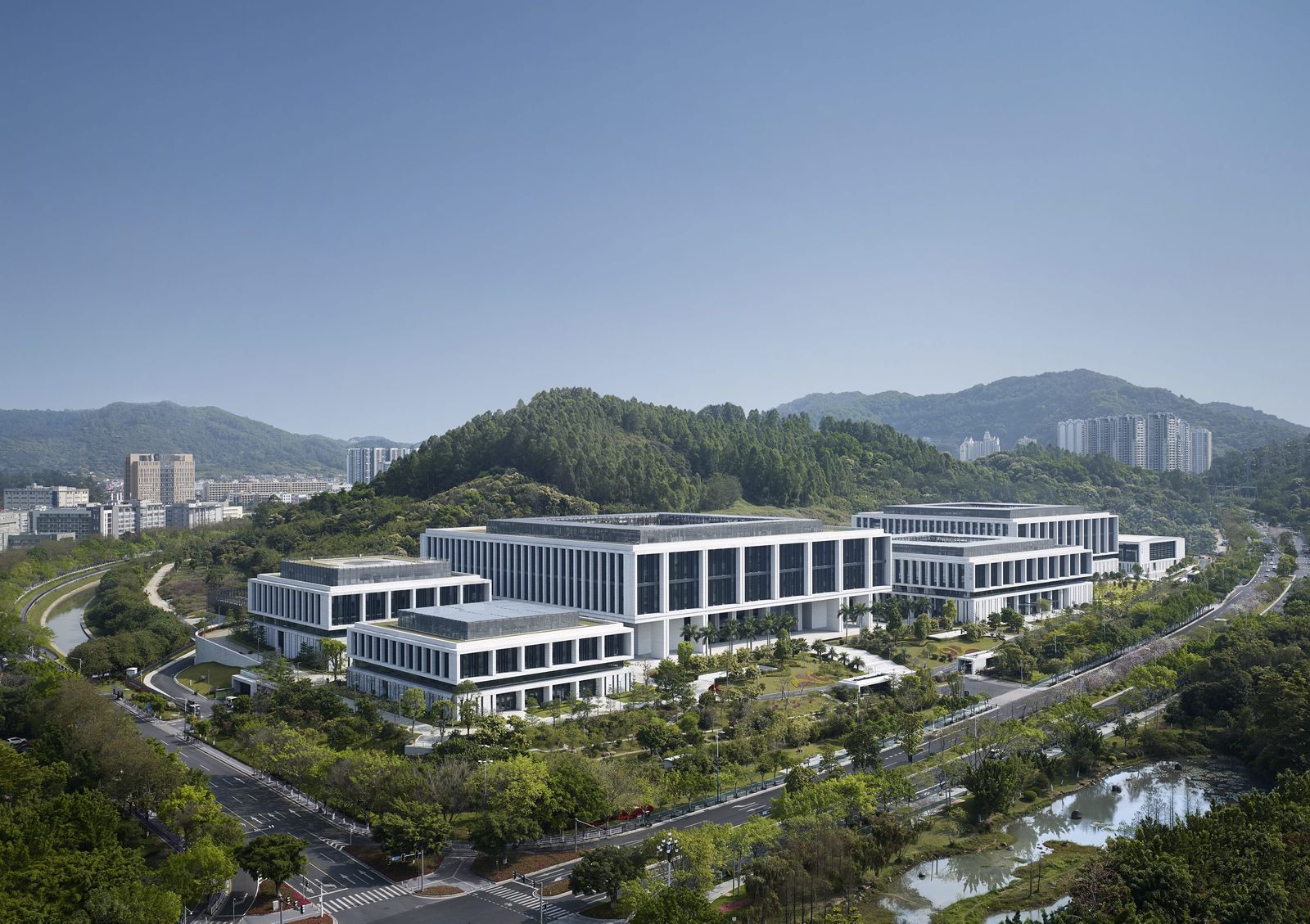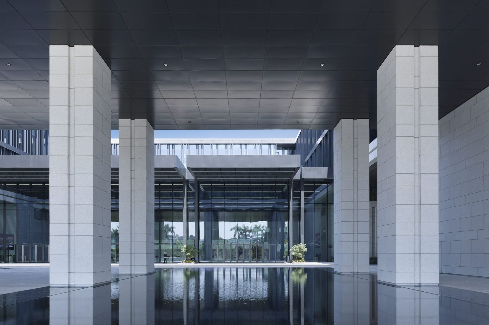 In addition to achieving LEED NC Gold certification for the main and conference buildings, the new campus of CSG China Southern Power Grid was awarded first prize in the category of Excellent Engineering Design 2018 in Guangzhou. The project is located in the Luogang district and is part of Guangzhou Science City. The eight buildings are spread out along the elongated plot at the foot of the Zhu Mountain. All buildings have been developed on the basis of a square footprint. The clearly discernible and unifying conceptual design of the buildings consists of a solid plinth, a transparent joint, and the building volumes themselves that seem to be floating above. The appearance of the multi-layered facades is dominated by the light-colored, vertical granite uprights. They form the conceptual leitmotif, combining several stories into one unit, and—on account of their depth—also function as solar shading. Behind the uprights, the curtain wall provides the thermal envelope which, with its anthracite-colored construction, creates a contrast to the light-colored natural stone. The choice of materials is continued in the interior, creating a flowing transition from the outside into the buildings and between the different functions on the campus. The main access to the campus leads from Kexiang Road in the south via ramps and a large flight of steps to the largest of the atrium buildings. Owing to its slighly set-back position, a large forecourt is created in front of the main building. Reflective water features guide people to the inner courtyard, half of which is protected by a glass roof and forms an entrance hall. To the west, with direct access from Xianshan Road, lies the conference center, which accommodates an auditorium with 600 seats and additional exhibition and events facilities. The building opposite serves as the central archive for all of the company’s institutions located in Guangzhou. Two further atrium buildings to the east of the main building accommodate offices and research and logistics facilities. Together with the canteen building at the slope, they form the central area of the precinct, which features a number of courtyards sunk into the ground. To the east the campus features sports facilities and an apartment building for members of staff and visiting guests.