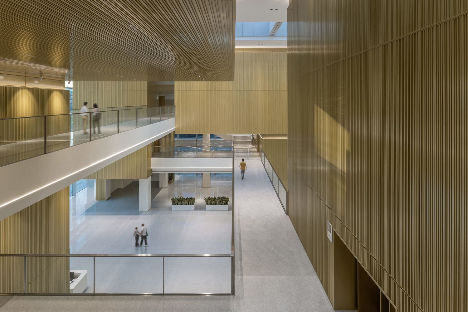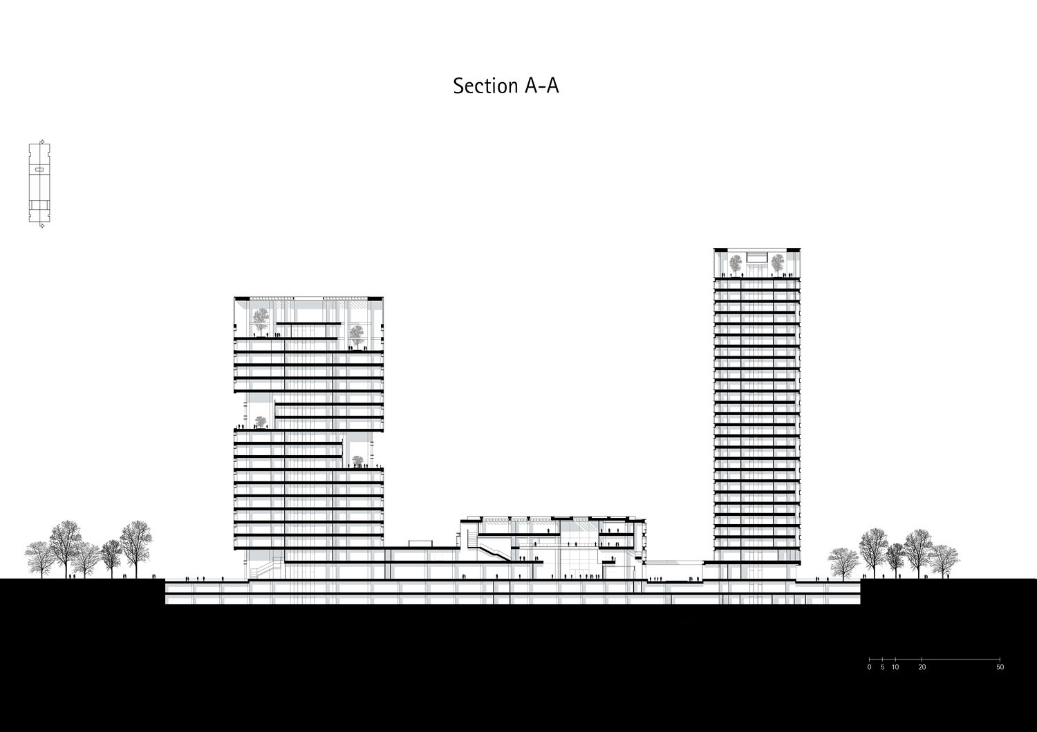 In the museum, the 'house-in-house' principle organises the climate-controlled exhibition boxes, and bridges and stairs connect these to form a circular route. Open ground floor areas and a public foyer integrate the building into the neighbourhood's network of paths. A continuous aluminium façade band unites the three volumes, while the different shells respond precisely to their respective functions: the office tower features sculpturally structured glass surfaces, the museum area has a transparent structure, and the apartment tower has vertically structured façade elements with integrated ventilation and technical zones. Terraces, light rooms and a roof garden complement the functional structure by adding social and ecological value.