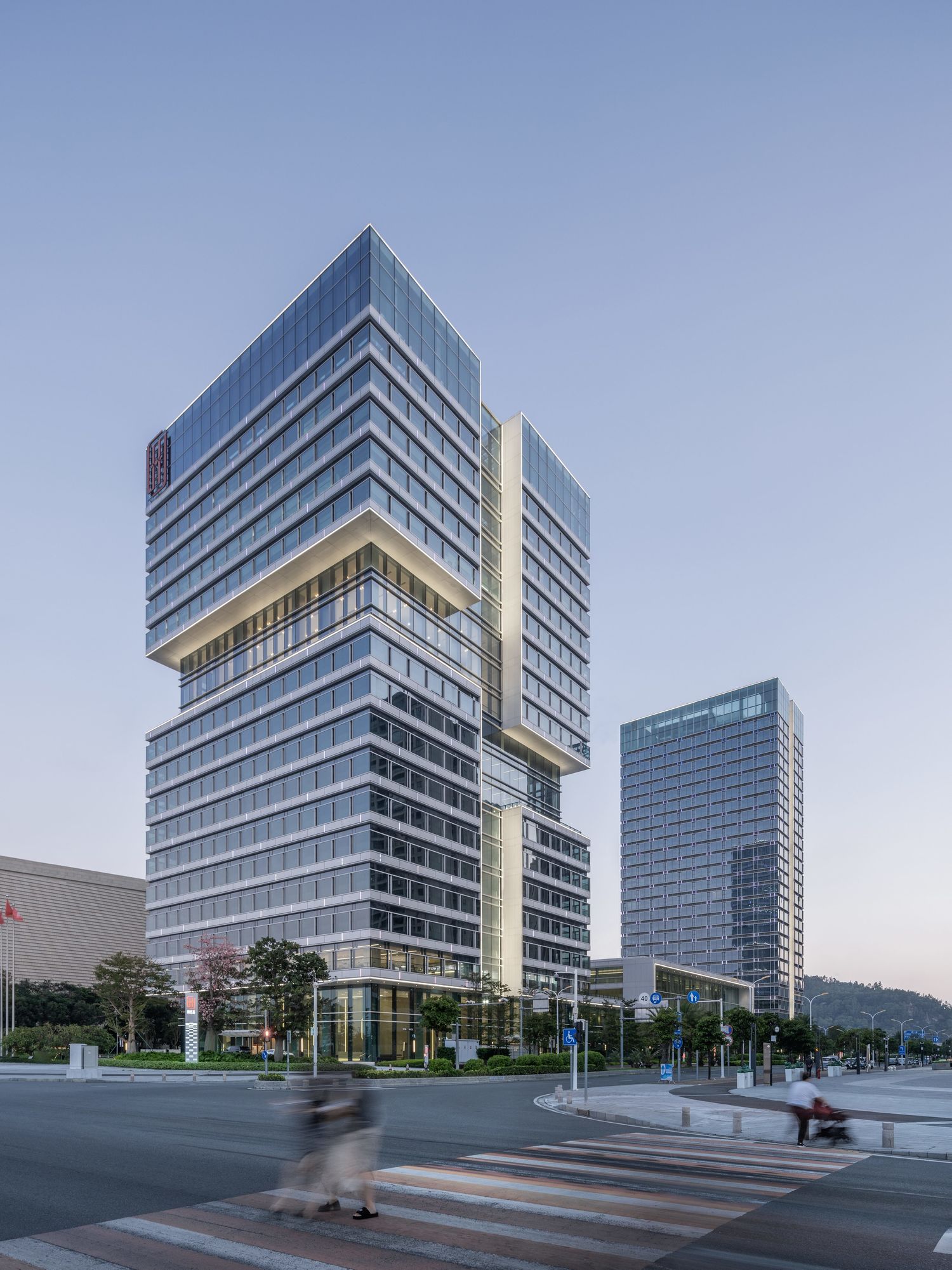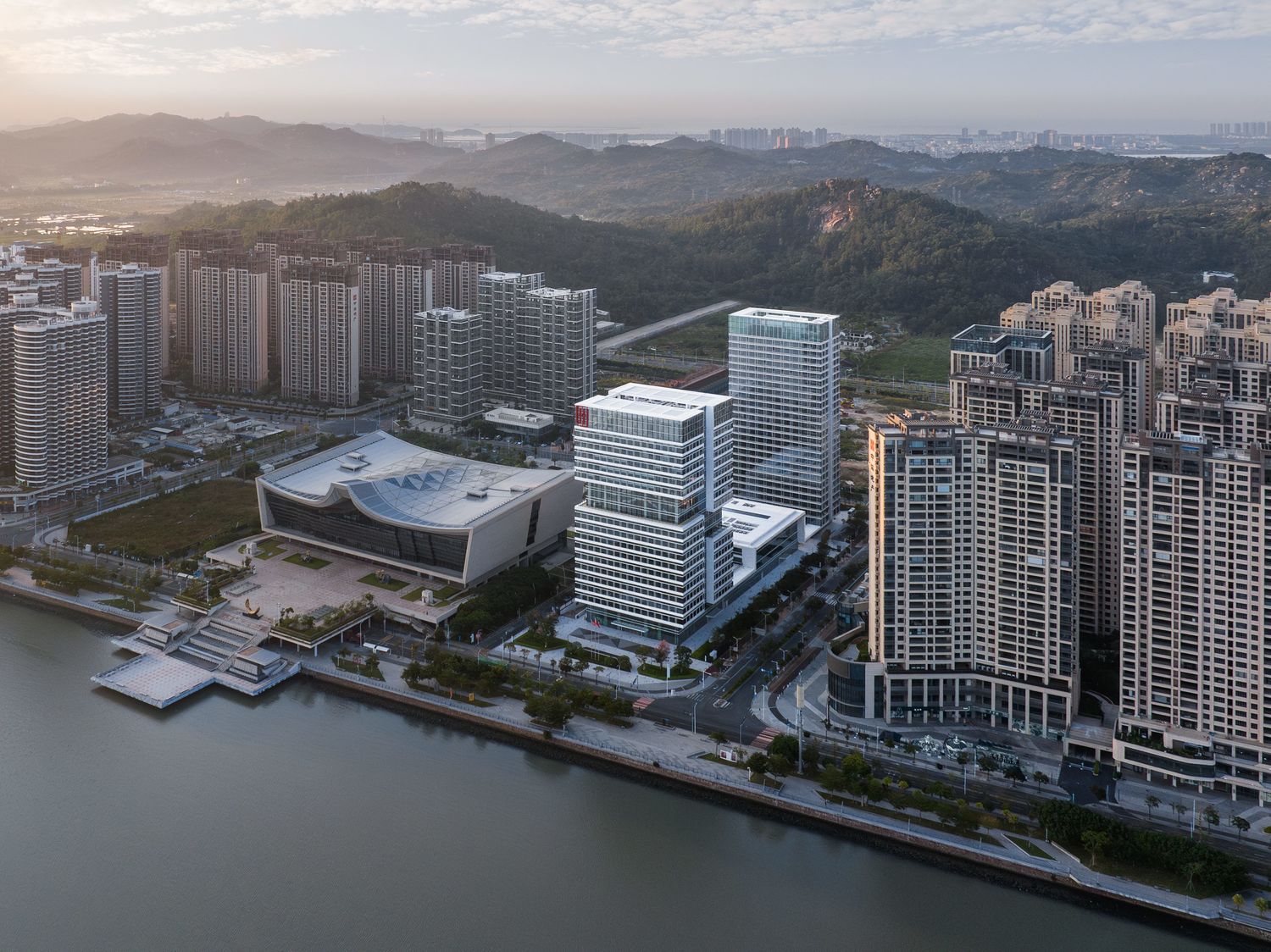Located in the heart of CITIC Binhai New Town in the Haojiang District of Shantou, CHJ Plaza is a mixed-use complex comprising an office tower, a museum and an apartment tower. It will serve as the headquarters of the CHJ Group. The project is located on the cultural axis of the newly developed urban structure, linking residential and cultural districts along the waterfront. The design arranges the three structures within the specified volume in a clear three-part division: the northern tower houses the company's administrative areas; the central museum building forms the project's central element and continues the public cultural axis; and the southern residential tower concludes the complex and opens up visual connections to the bay.