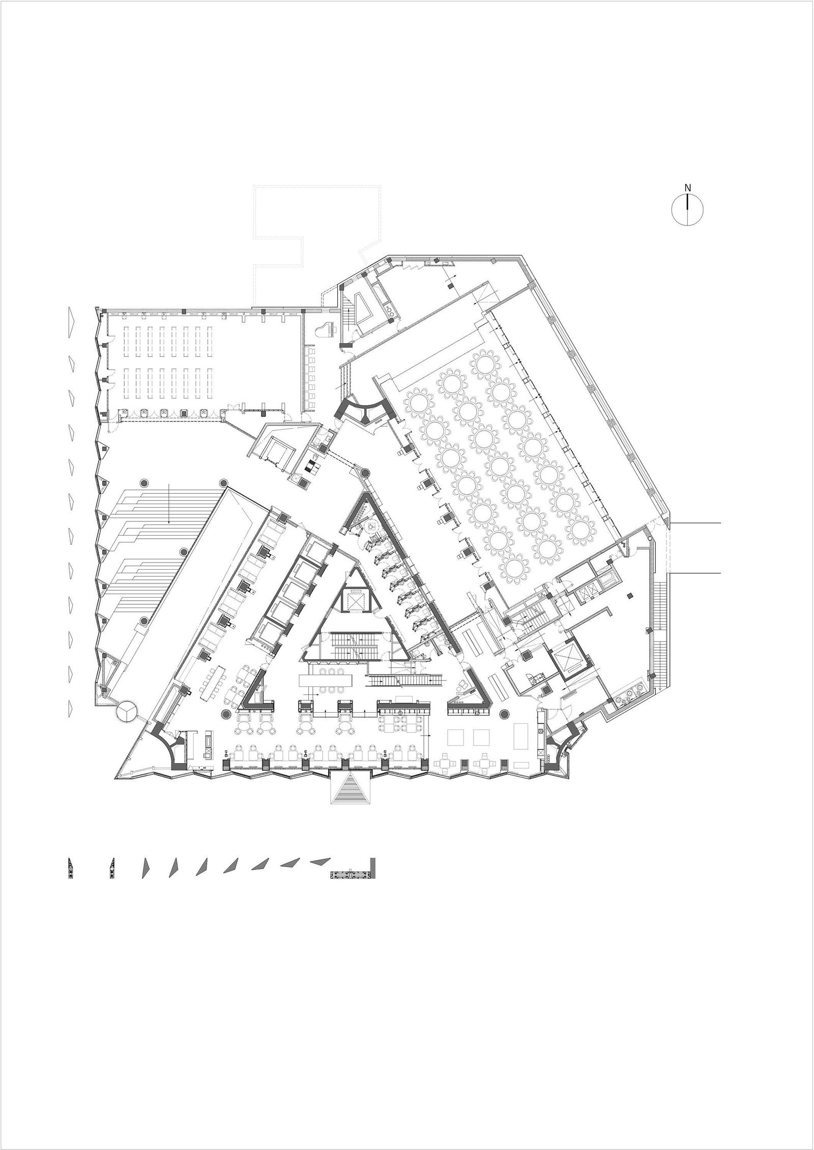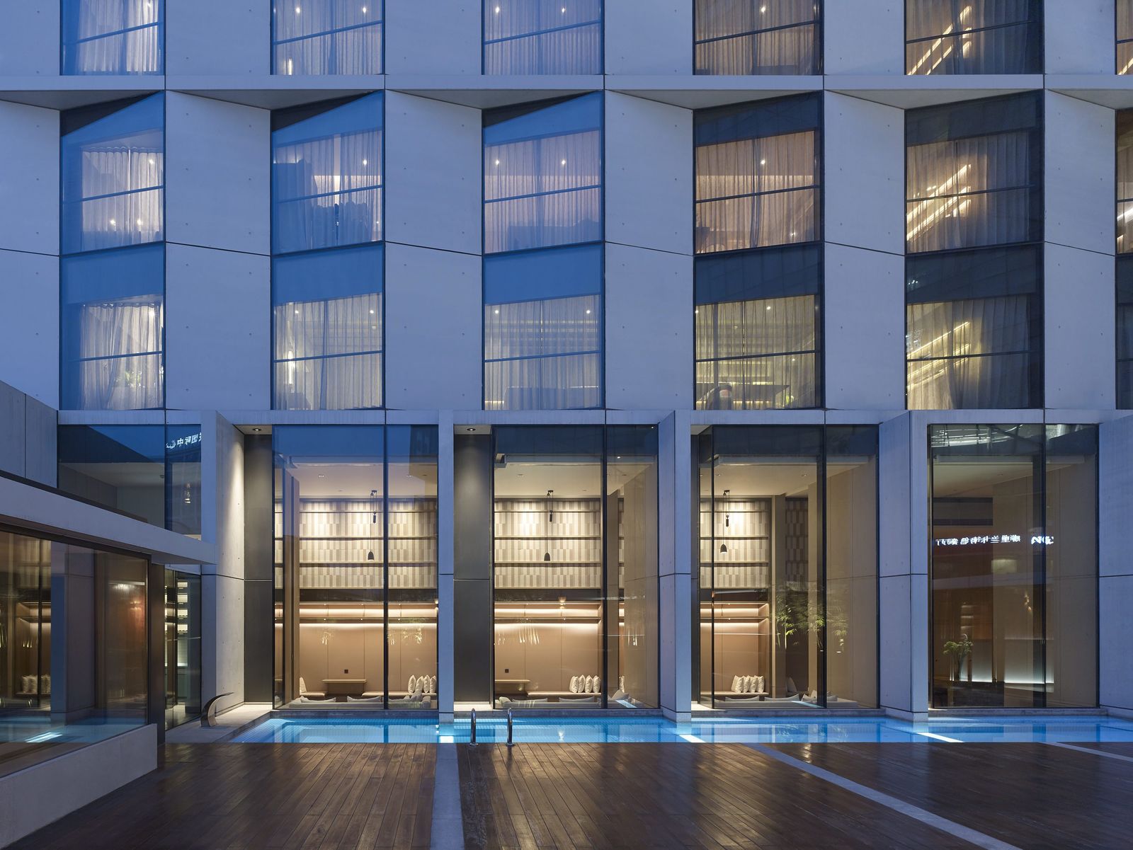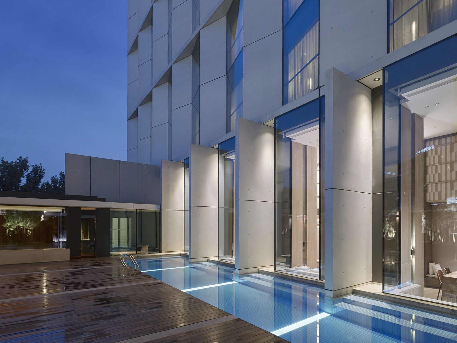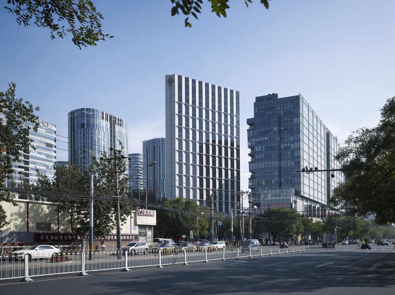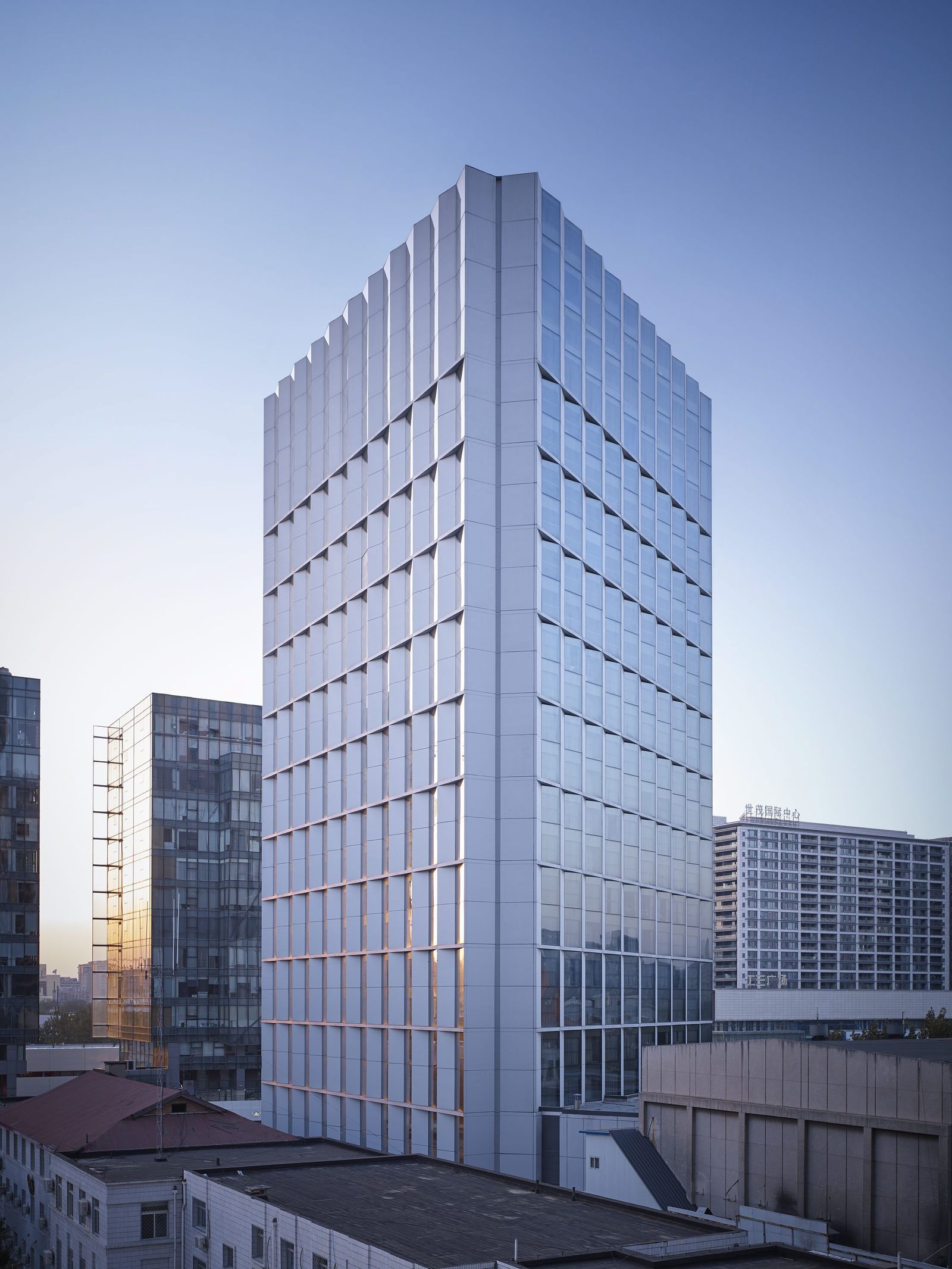 Since its modernization and reopening in 2016, the 80-meter-high hotel tower dating from 1990 has been one of the popular destinations in the Sanlitun business quarter of Beijing. The new facade designed by gmp gives the building—which can be seen from afar‒a light and sculptural effect. Its angled vertical elements and the alternating closed and glazed panels create a play of light and shadow. Horizontal ledges are inserted every two stories, thus creating a calm facade geometry with balanced proportions. The three-dimensional zig-zag-like building envelope reflects the triangular footprint of the 26-story tower. Curtain-wall elements in light gray glass-fiber concrete alternate with gray-tinted glass panels, and the angled arrangement of these panels and elements means that, depending on the viewing angle, the sides of the building appear to change between open and closed. The materials and structure of the high-rise facade continue in the new extended entrance area of the hotel. Likewise, the venue modernized by gmp reflects the clear geometry of the facade design. Supported by an arched structure, a double-skin roof with an external layer of glazing and internal louvers admits daylight into the “Glasshouse”, creating an almost spiritual atmosphere.
