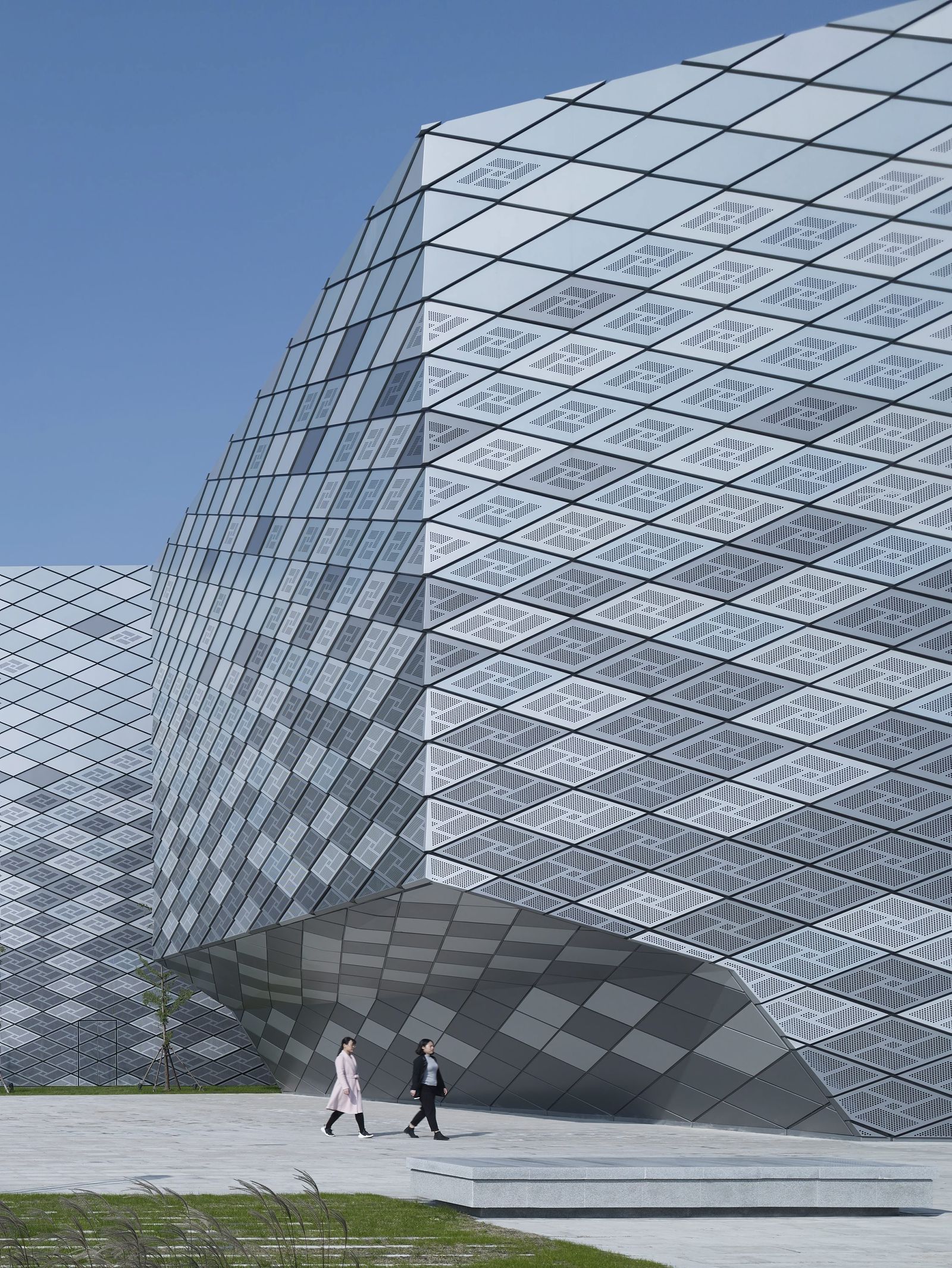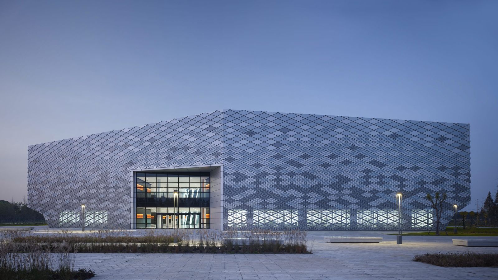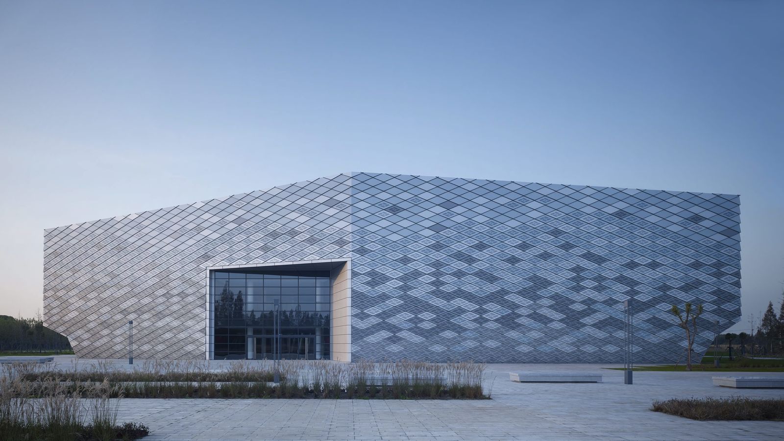 The Oriental Land Shanghai leisure park is located some 27 kilometers outside the city of Shanghai at Zhujiajiao in the Qingpu District. Directly adjacent to the technical exhibition complex, a training center has been created in which groups of school pupils can learn how to behave correctly in dangerous situations. The three-story development consists of five parallel blocks that are slightly offset from each other and whose upper floors cantilever at the ends. A central hall running from north to south connects the building blocks as a central atrium. The different building blocks are accessed from the lobby and the surrounding galleries. A scale–like metal facade consisting of diamond-shaped panels covers the entire building complex; only the north and south entrances and the junctions between the blocks feature glazed facades. The room-high glazing between the building blocks provides views, making the sequence of blocks evident as one passes through the building. Depending on the angle of the light, the blue-gray metal panels of the facade of the training center appear to merge, like camouflage, with the surroundings. Perforated panels allow light to fall into the rooms behind them and cover the ventilation openings. Parametric facade design was used to make economic serial production possible in spite of the complex geometry of the exterior envelope—an important factor given the tight budget.