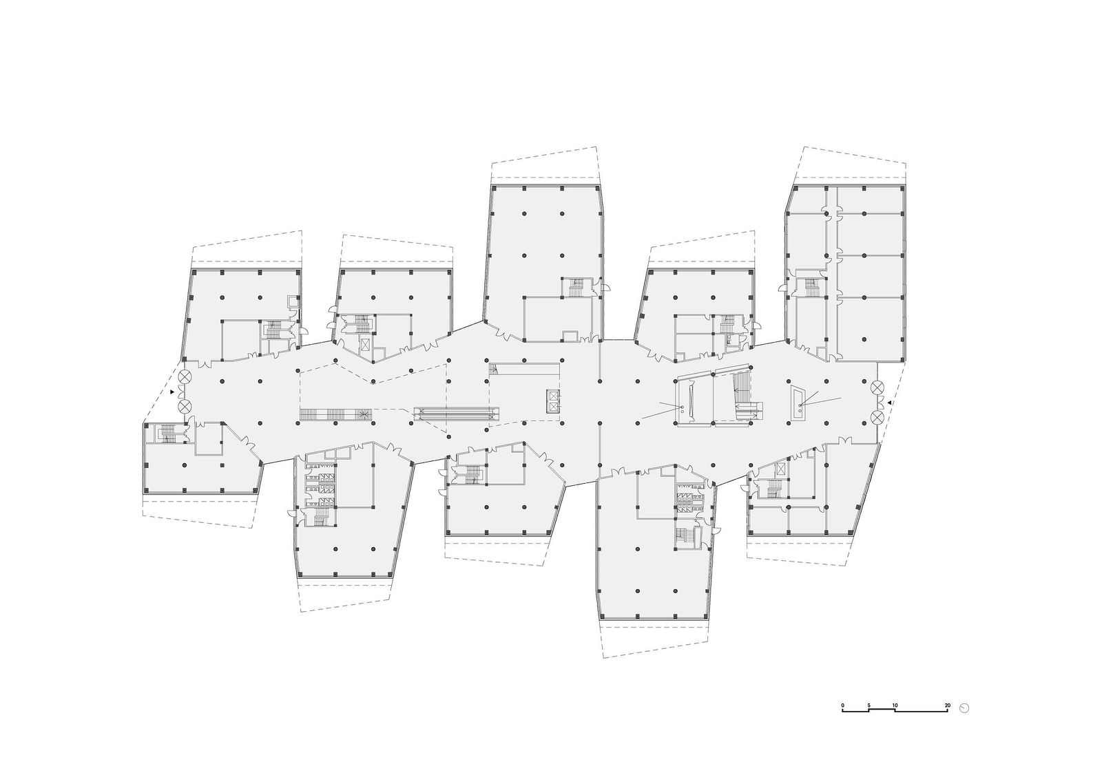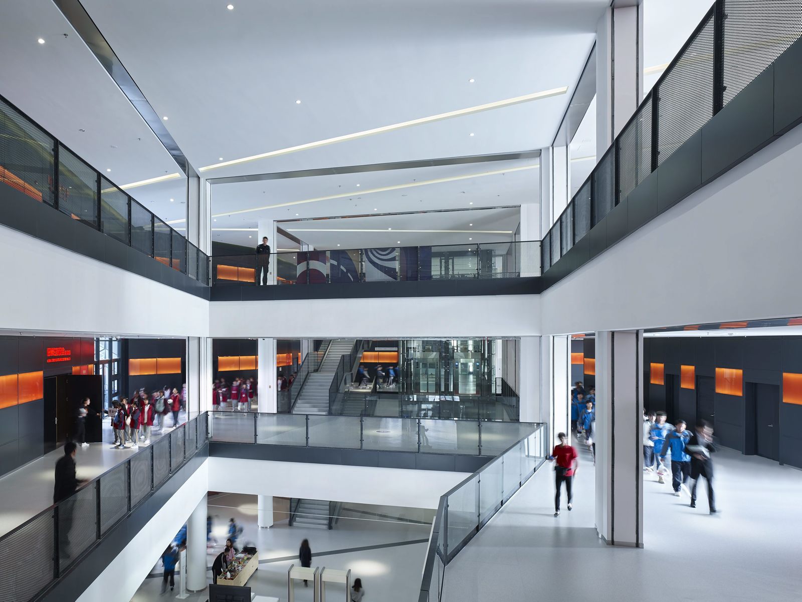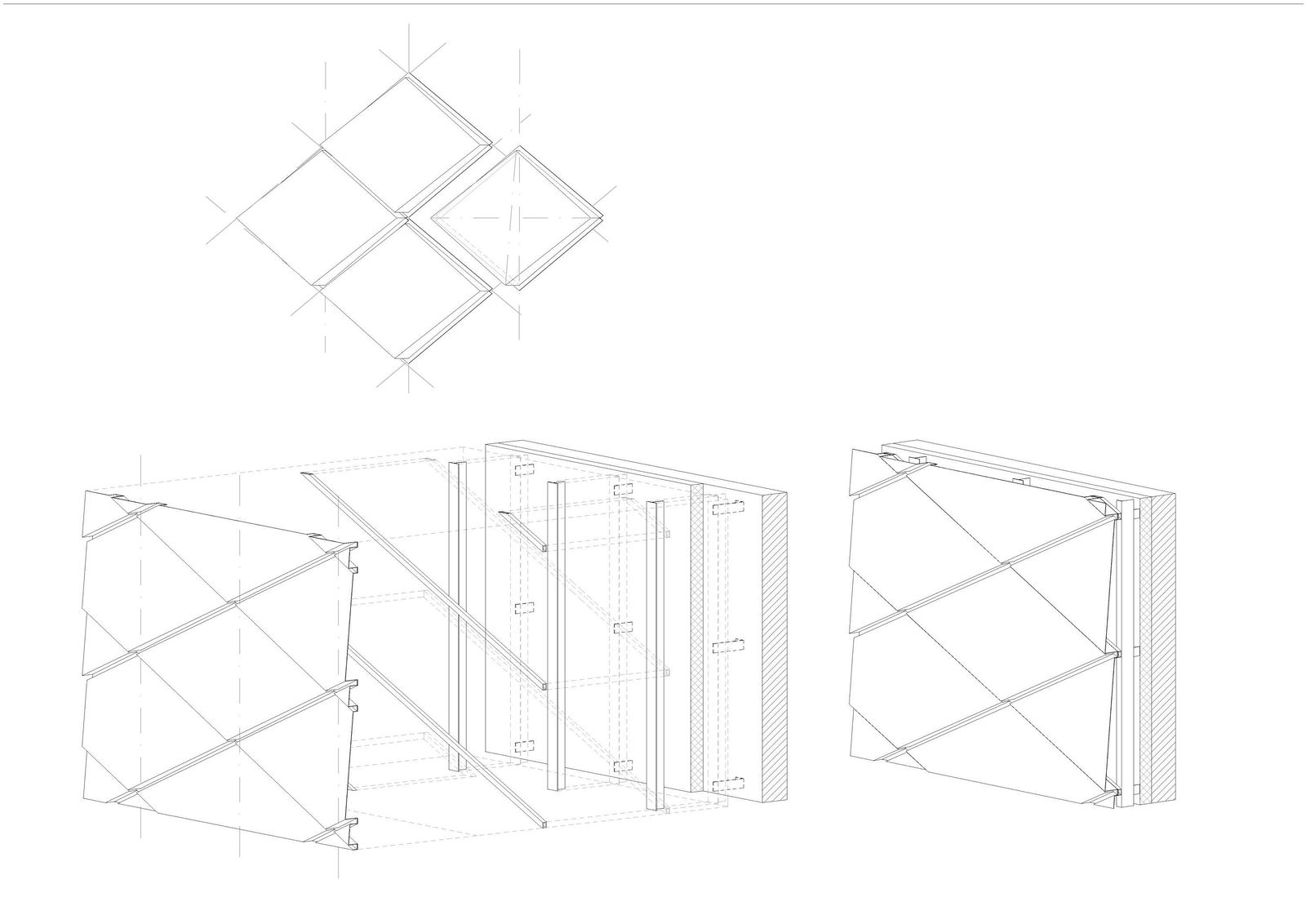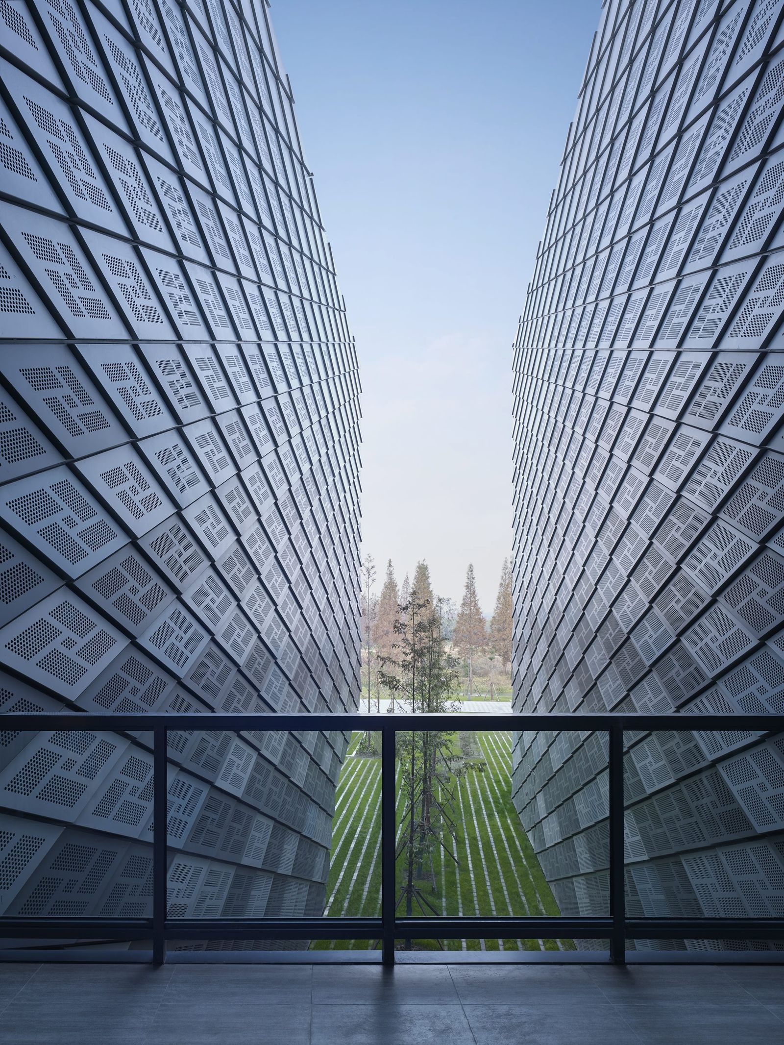 The Oriental Land Shanghai leisure park is located some 27 kilometers outside the city of Shanghai at Zhujiajiao in the Qingpu District. Directly adjacent to the technical exhibition complex, a training center has been created in which groups of school pupils can learn how to behave correctly in dangerous situations. The three-story development consists of five parallel blocks that are slightly offset from each other and whose upper floors cantilever at the ends. A central hall running from north to south connects the building blocks as a central atrium. The different building blocks are accessed from the lobby and the surrounding galleries. A scale–like metal facade consisting of diamond-shaped panels covers the entire building complex; only the north and south entrances and the junctions between the blocks feature glazed facades. The room-high glazing between the building blocks provides views, making the sequence of blocks evident as one passes through the building. Depending on the angle of the light, the blue-gray metal panels of the facade of the training center appear to merge, like camouflage, with the surroundings. Perforated panels allow light to fall into the rooms behind them and cover the ventilation openings. Parametric facade design was used to make economic serial production possible in spite of the complex geometry of the exterior envelope—an important factor given the tight budget.