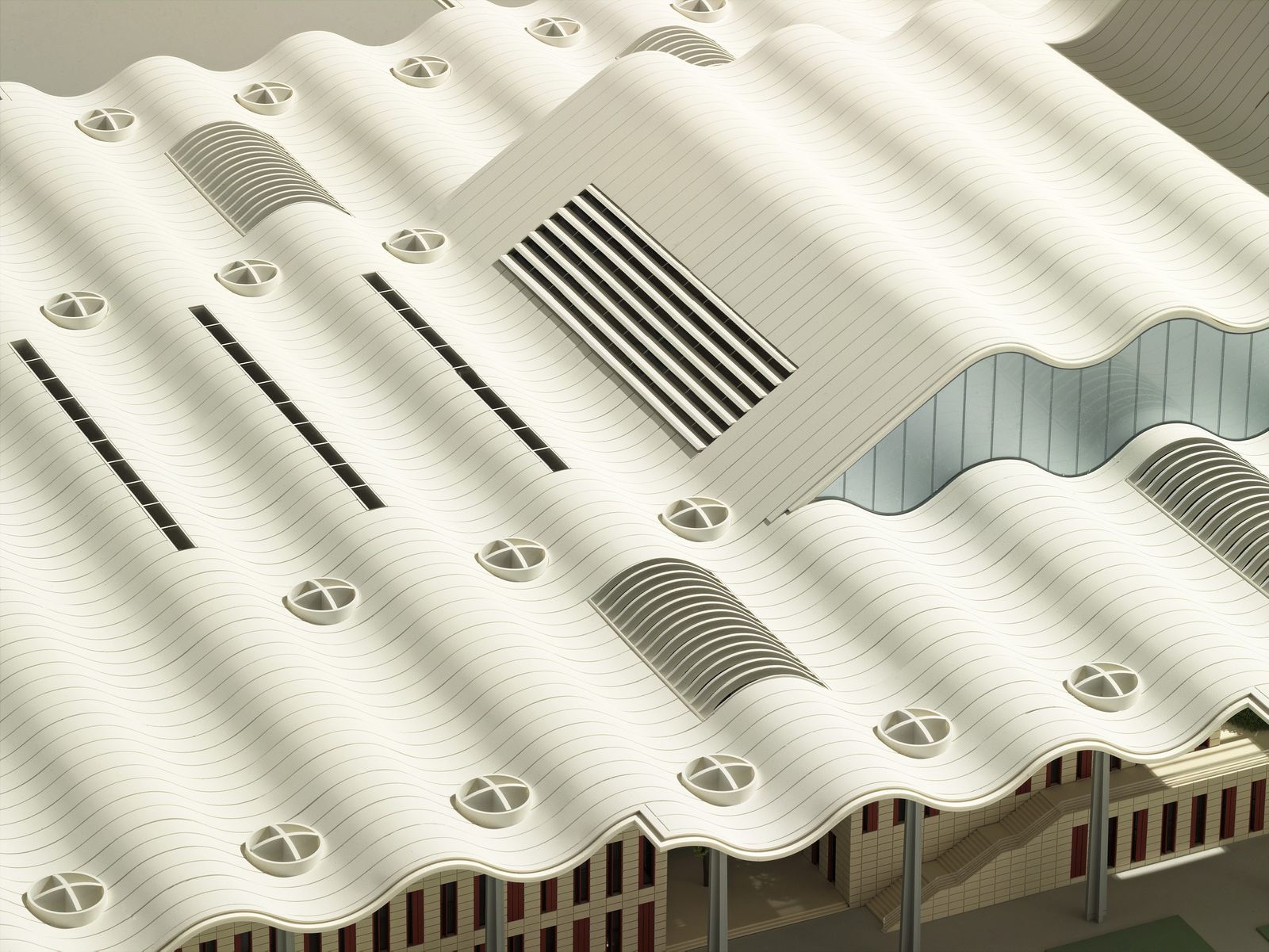 The National Conference Center (NCC), comprising a conference center, hotel, and museum, is set within an expansive landscaped garden characterized by thematic and symbolic references to Vietnamese culture and tradition. Located directly south of the NCC is a multifunctional plaza, the Fountain Square, which serves as a venue for ceremonial events and public gatherings. The square is flanked on its eastern and western sides by a grove of flagpoles and two pools of water. To the south, a palm grove frames the plaza and marks the entrance to the NCC. The expressive, undulating roof spanning the complex accompanies visitors along their route through the foyer. Rising to its greatest height above the main congress hall, it forms a distinctive landmark in the cityscape of Hanoi.
