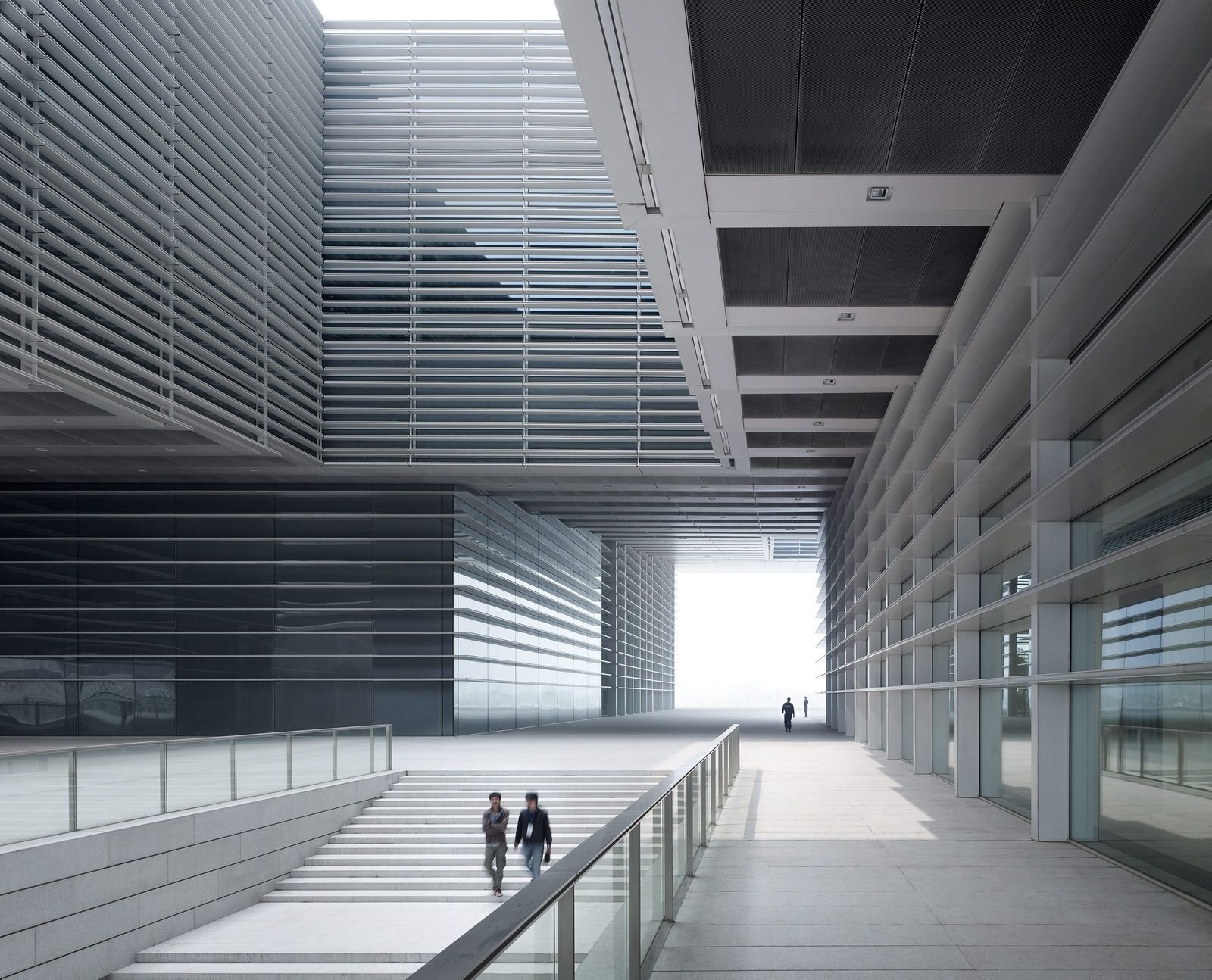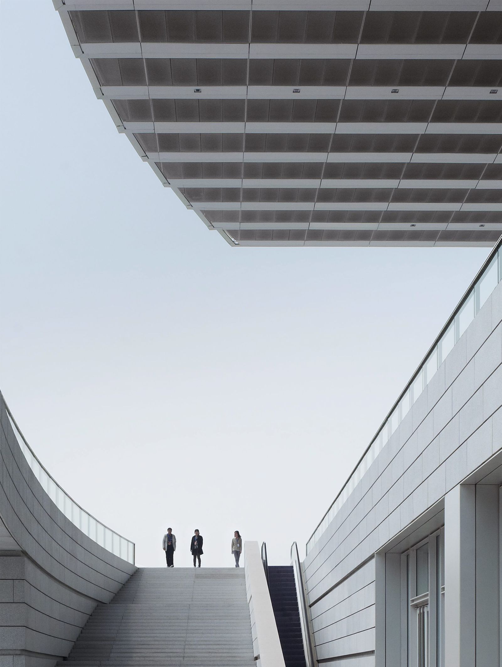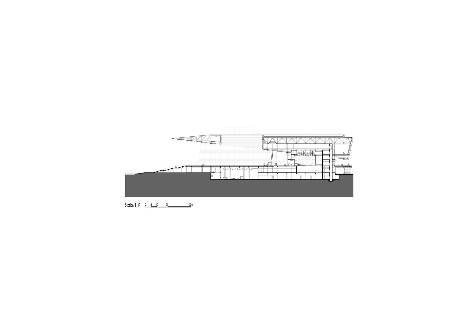 The Grand Theater forms the eastern end of the 90-hectare cultural park of Tianjin with several cultural buildings grouped around a central, artificially created lake. Consisting of three independent concert and event halls on plinth that is accessed via exterior steps, the building, which faces the lake, presents itself as a stage for urban life. The shape of the deeply cantilevered roof construction alludes to the neighboring Tianjin Museum of Natural Science. Competition 2009 – 1st prize Design Meinhard von Gerkan and Stephan Schütz with Nicolas Pomränke Partner Firm China ECADI Client Tianjin Culture Centre Project and Construction Head Office GFA 59,000 m² Seats, opera hall 1600 Seats, concert hall 1200 Seats, small multifunctional hall 400 Construction period 2010–2012 Photographer