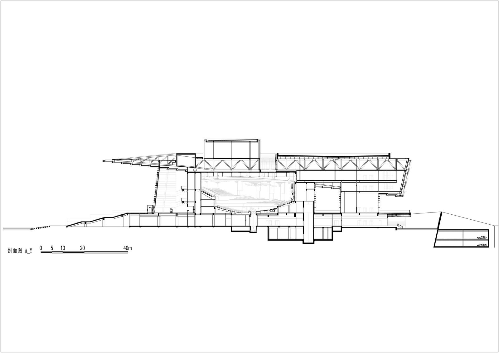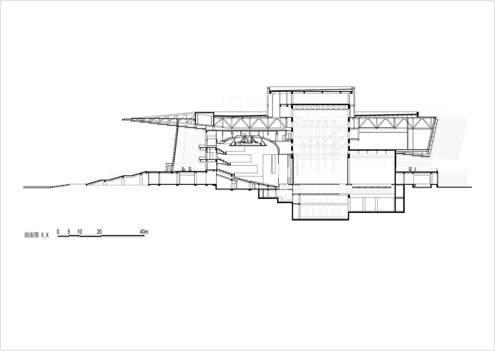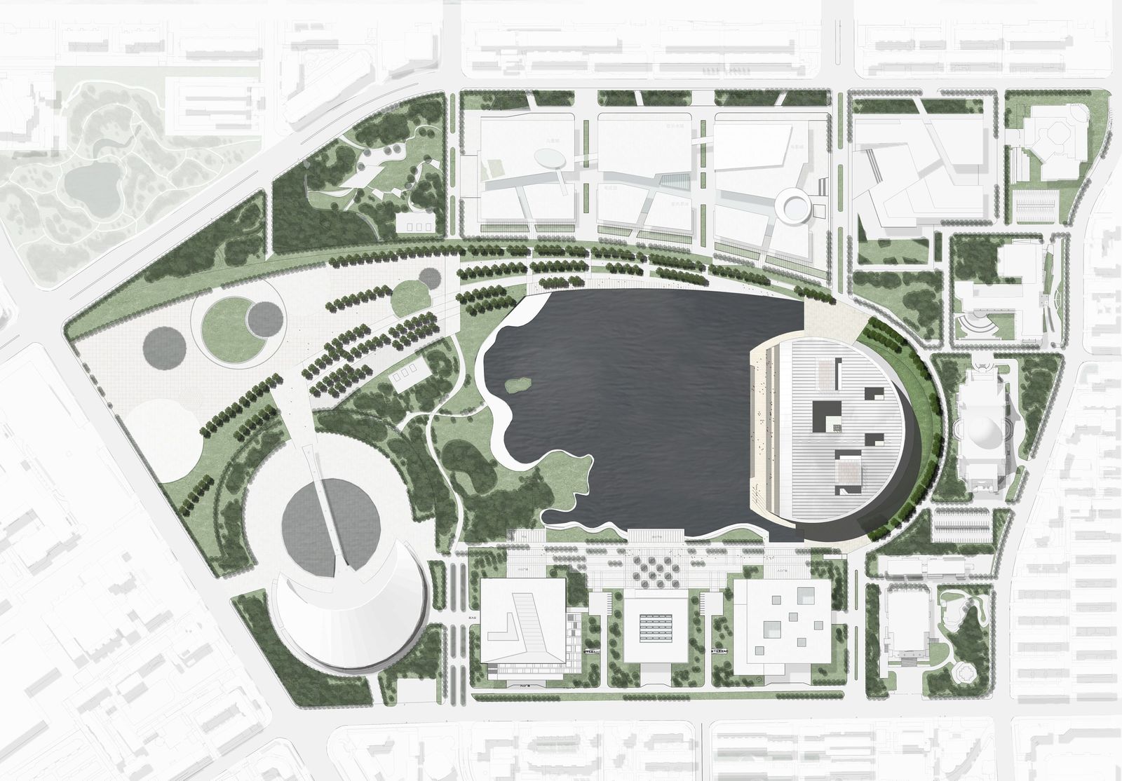 The Grand Theater forms the eastern end of the 90-hectare cultural park of Tianjin with several cultural buildings grouped around a central, artificially created lake. Consisting of three independent concert and event halls on plinth that is accessed via exterior steps, the building, which faces the lake, presents itself as a stage for urban life. The shape of the deeply cantilevered roof construction alludes to the neighboring Tianjin Museum of Natural Science. Competition 2009 – 1st prize Design Meinhard von Gerkan and Stephan Schütz with Nicolas Pomränke Partner Firm China ECADI Client Tianjin Culture Centre Project and Construction Head Office GFA 59,000 m² Seats, opera hall 1600 Seats, concert hall 1200 Seats, small multifunctional hall 400 Construction period 2010–2012 Photographer