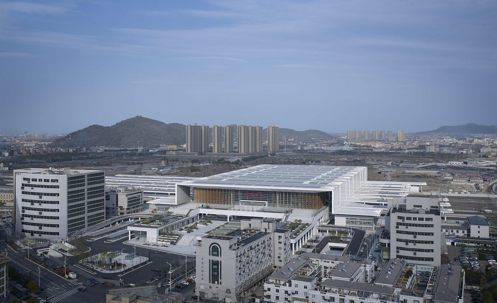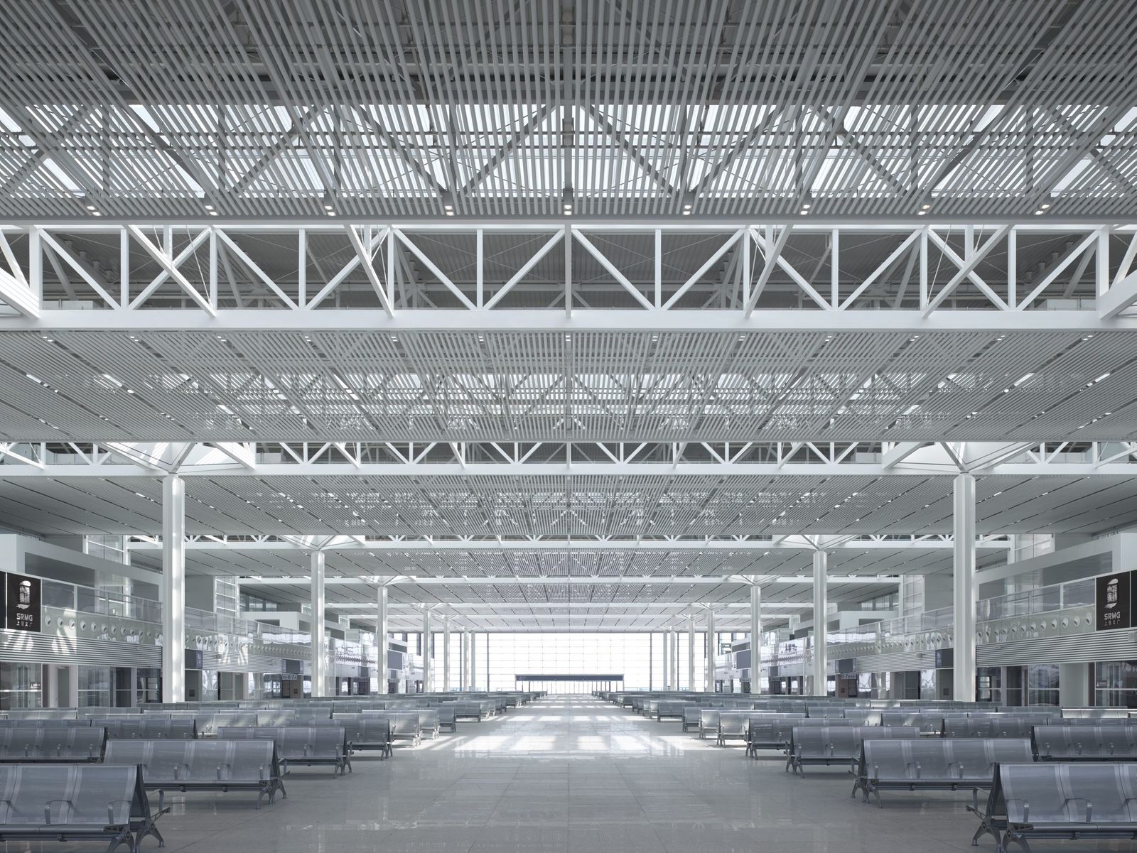 The Hangzhou South railway station is on the high-speed line between Shanghai and Kunming. It is made up of two corresponding elements―the solid plinth and the folded roof above. Rising in a gentle incline from the two station forecourts to the west and east, the plinth levels out at the top where it accommodates the concourse. Below this is a plaza that provides a pedestrian link between two new adjoining parts of the city. The roof covers both the concourse and the 21 platforms, folding downwards to the lower level at the transition to the tracks. Its fenestration bands replicate the irregular pattern of the tracks. The roof was designed as a fifth facade to take account of the fact that the station is surrounded by hills and high-rise buildings from where there is a good view of the roof from above. Whilst the solid plinth is built of reinforced concrete, the roof structure is entirely of steel. It rests on slender cross supports that are arranged along four axes: two of these axes continue through the 84-meter-wide concourse, the middle of which features a 42-meter-wide column-free span. The steel frame substructure can be seen behind the inner lining of rounded slatwork. The floor finish throughout the concourse and on the forecourts consists of light gray Shandong granite.