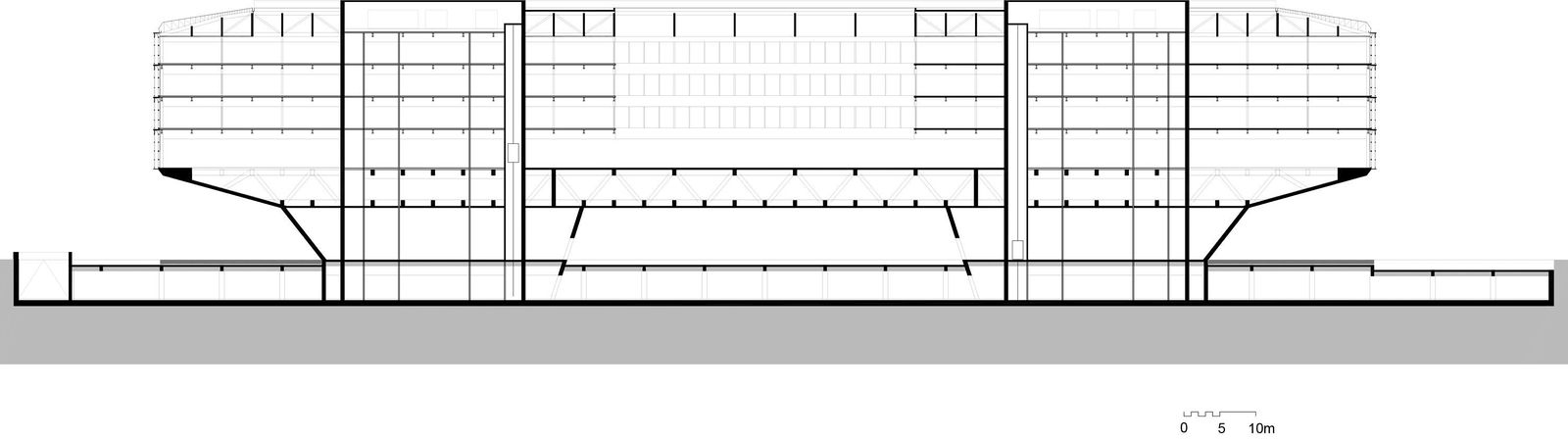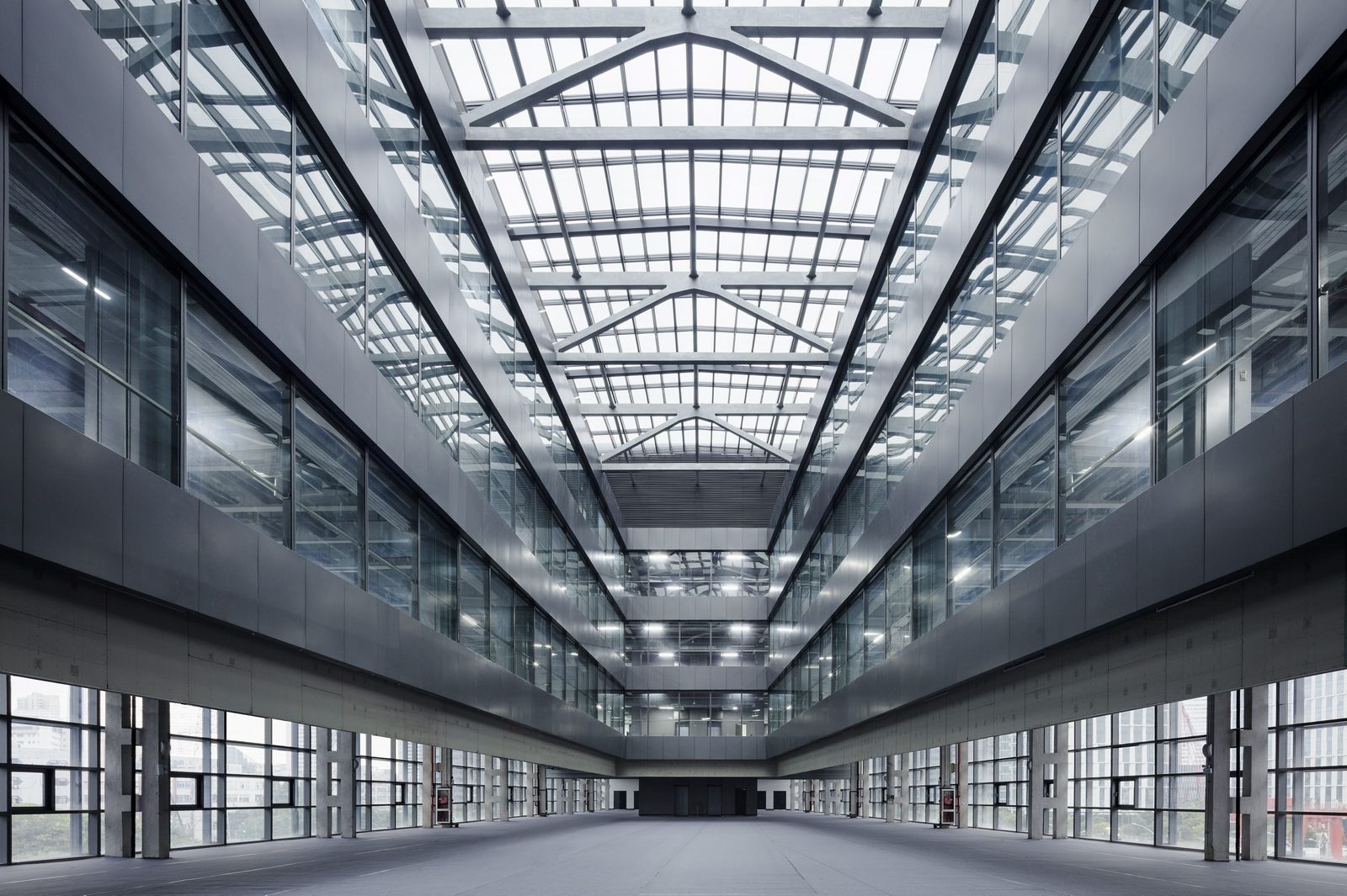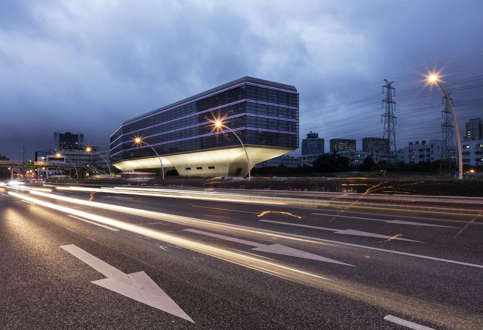 With Caohejing Xinzhou Plaza, designed by Architects von Gerkan, Marg and Partners (gmp), another project has been created for the Shanghai Caohejing Hi-Tech Park Development Corp. in the Chinese metropolis of Shanghai. Caohejing Xinzhou Plaza has been designed as a prismatic glass volume resting on two conical pilotis. The building measures 170 meters in length, max. 28 meters in width, and about 30 meters in height. The aluminum frame structure of the facades has been constructed as an external double skin with solar screening on the inside. The two building cores, together with two story-high reinforced concrete bearers as floor deck and at roof level, form the primary loadbearing structure. The rooms of the building are flexibly usable in both the horizontal and vertical planes. At the heart of the building lies a showroom that takes up the whole depth and, due to the structural system, is completely free from columns; this is used as an atrium that extends throughout the height of the building. Taking its cue from the dynamic of the passing traffic, the crisscrossing pathways, and visual relationships, the building symbolically contributes to the urban development of this originally industrial part of the city. Caohejing Xinzhou Plaza appears to be freestanding on three sides and, in this exposed position, can be seen from afar. The open area beneath the raised volume of the building provides the connection with the nearby public park and can also be used as a roofed-over area for meetings and events.