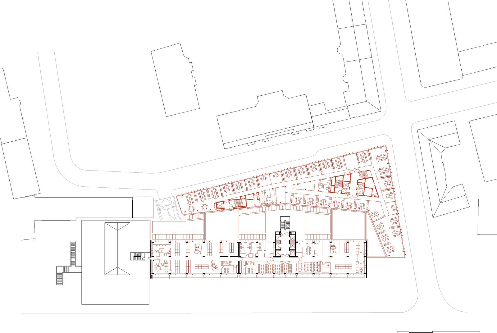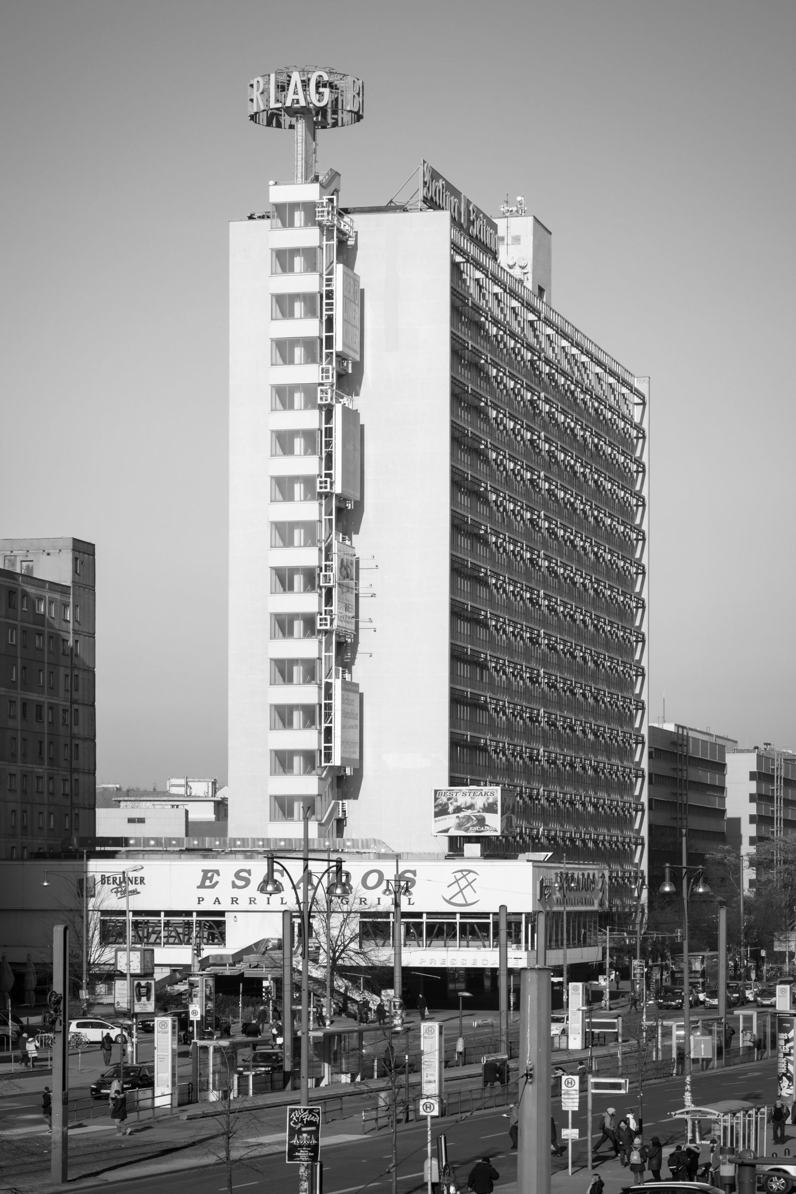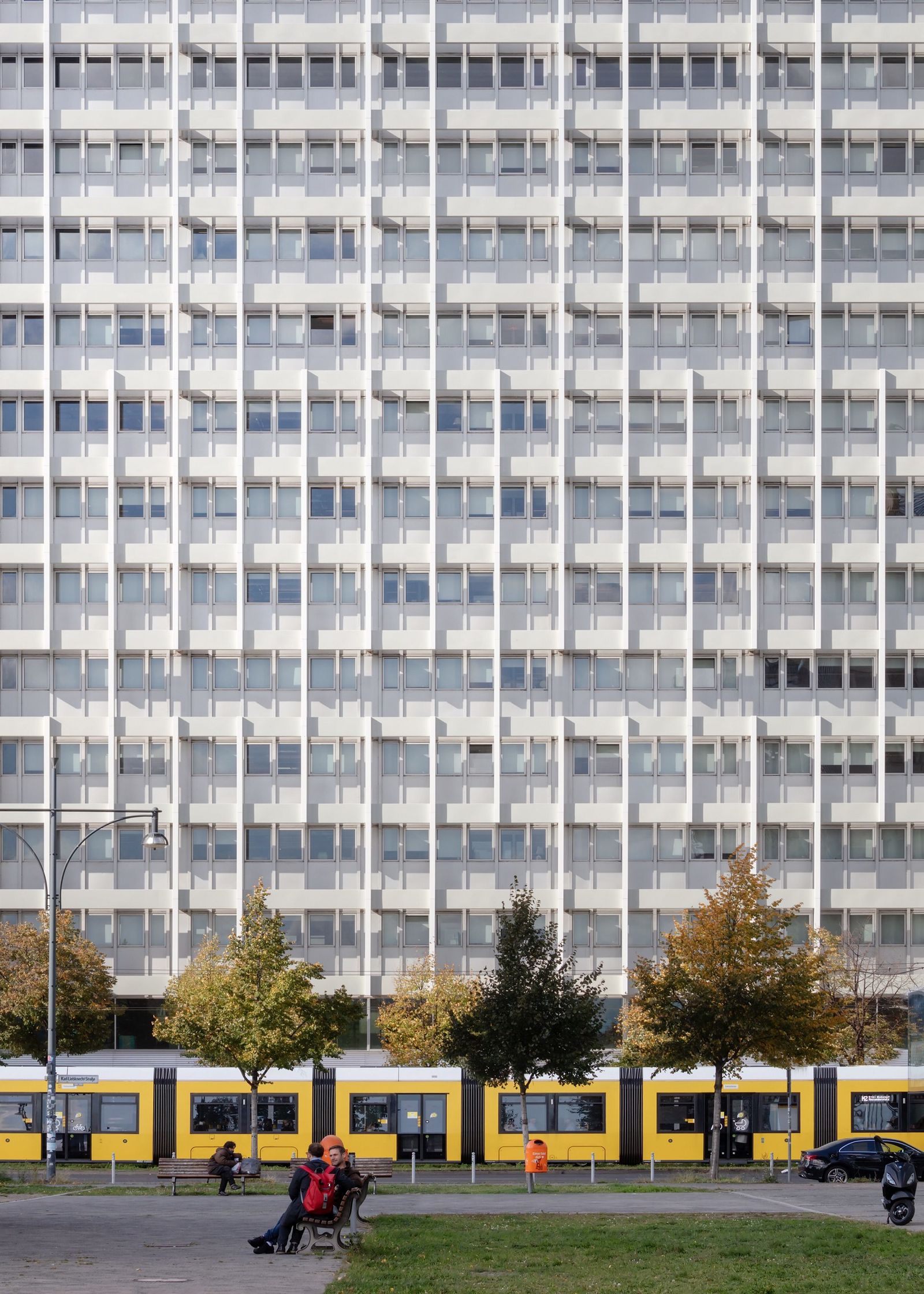 The Pressehaus am Alexanderplatz was constructed in 1970–1973 for the Berliner Verlag publishing house based on plans by architects Karl-Ernst Swora, Rainer Hanslik, Günter Derdau, Waldemar Seifert, and Gerhard Voss. It was built a competition to the Axel Springer high-rise completed in 1965 in West Berlin. gmp’s commission includes successive refurbishment and maintenance of the building ensemble according to the specifications for monument preservation as well as a new building part. The completion of the first construction phase made it possible to reopen the 17-story, 92-meter-long high-rise section with office and commercial units in May 2019. The building now has retained its original, listed facade structure. The glazed stairwell tower on the narrower southwest side, which has also been authentically refurbished, connects to the former Pressecafé. Refurbishment of the elevated, flat-roofed restaurant building featuring large glass facades began in summer 2019 and the characteristic exterior mural by artist Willi Neubert (1920–2011) is now visible again. At the same time, construction started on the New Podium designed by gmp, which will replace the former flat-roofed structure at the northwest end to the rear. The new office building, whose design follows the sloping roofs of the neighboring Scheunenviertel district, forms a single unit with the high-rise and Pressecafé in terms of both form and function, without diminishing their importance as monuments.