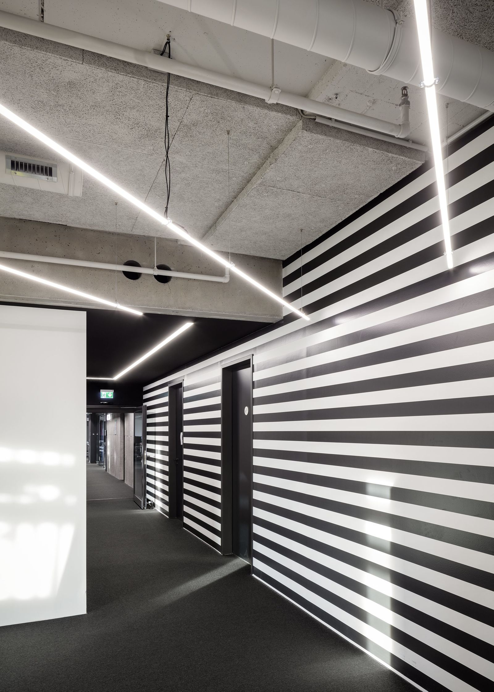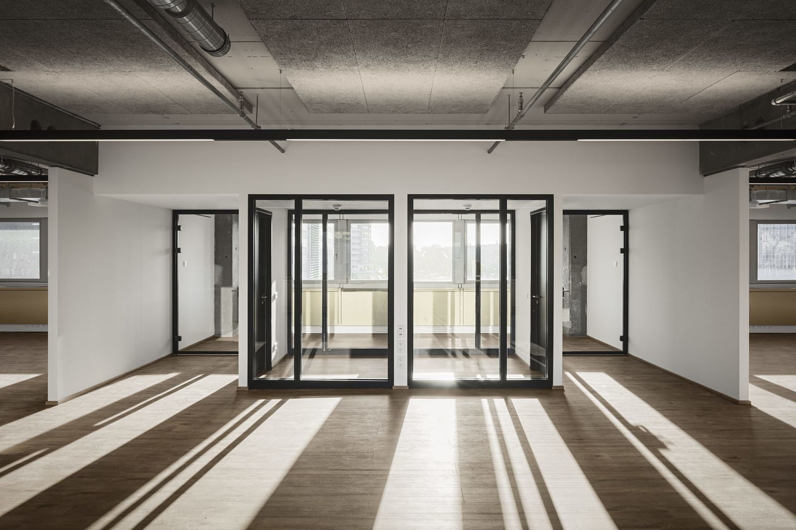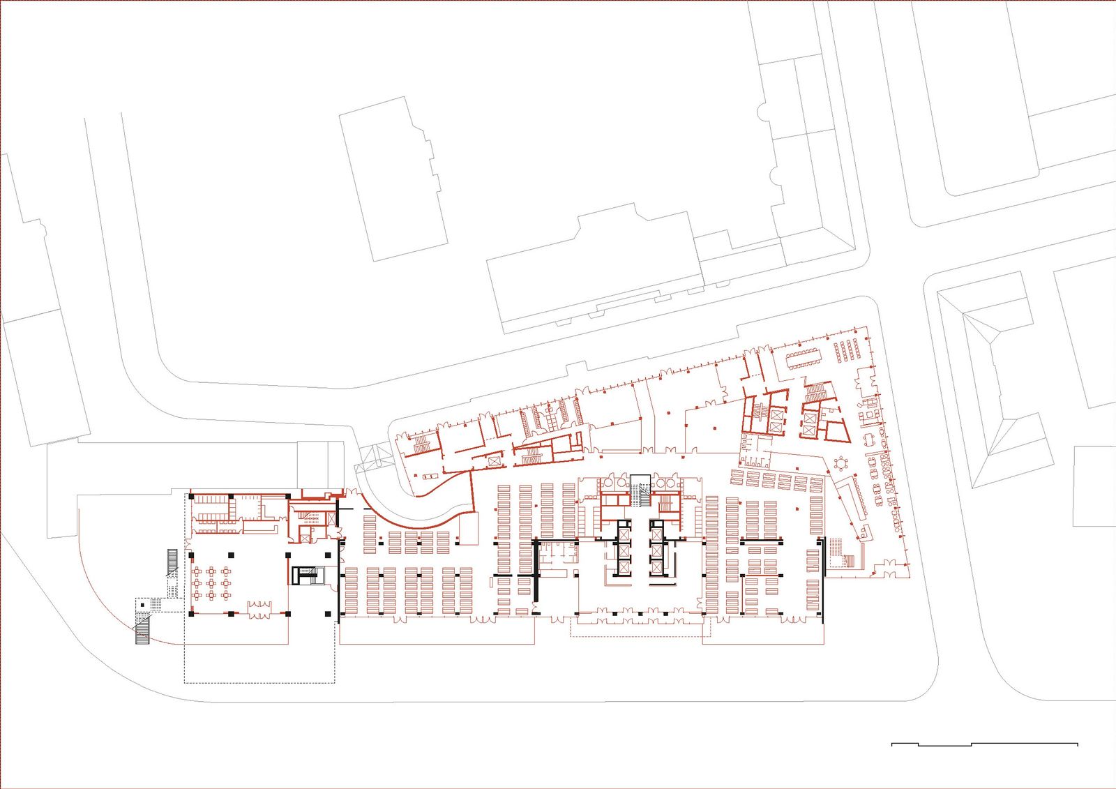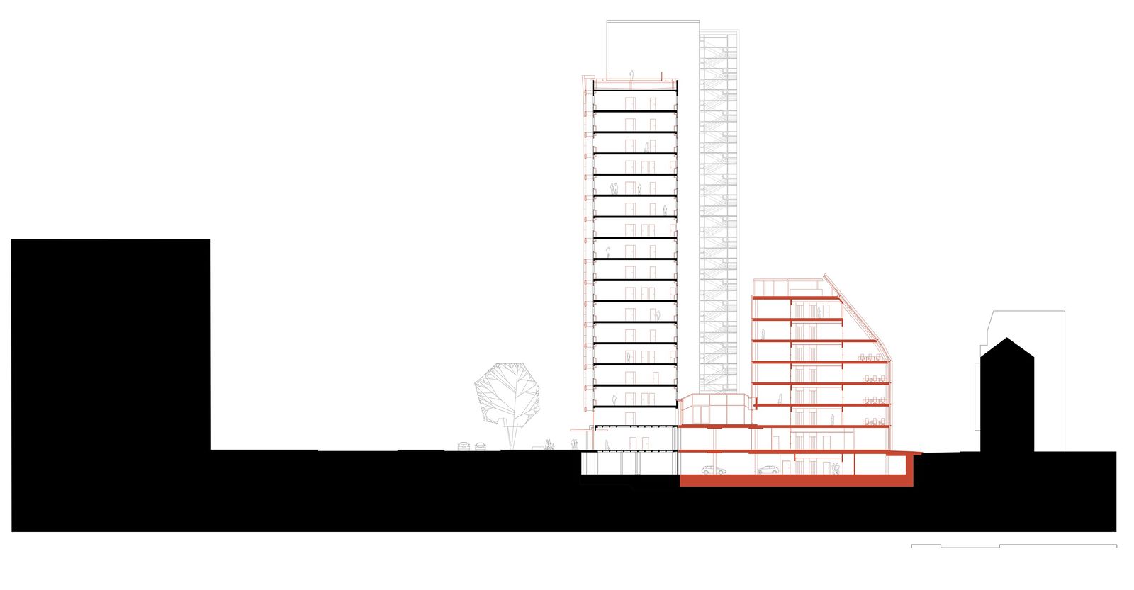 The Pressehaus am Alexanderplatz was constructed in 1970–1973 for the Berliner Verlag publishing house based on plans by architects Karl-Ernst Swora, Rainer Hanslik, Günter Derdau, Waldemar Seifert, and Gerhard Voss. It was built a competition to the Axel Springer high-rise completed in 1965 in West Berlin. gmp’s commission includes successive refurbishment and maintenance of the building ensemble according to the specifications for monument preservation as well as a new building part. The completion of the first construction phase made it possible to reopen the 17-story, 92-meter-long high-rise section with office and commercial units in May 2019. The building now has retained its original, listed facade structure. The glazed stairwell tower on the narrower southwest side, which has also been authentically refurbished, connects to the former Pressecafé. Refurbishment of the elevated, flat-roofed restaurant building featuring large glass facades began in summer 2019 and the characteristic exterior mural by artist Willi Neubert (1920–2011) is now visible again. At the same time, construction started on the New Podium designed by gmp, which will replace the former flat-roofed structure at the northwest end to the rear. The new office building, whose design follows the sloping roofs of the neighboring Scheunenviertel district, forms a single unit with the high-rise and Pressecafé in terms of both form and function, without diminishing their importance as monuments.