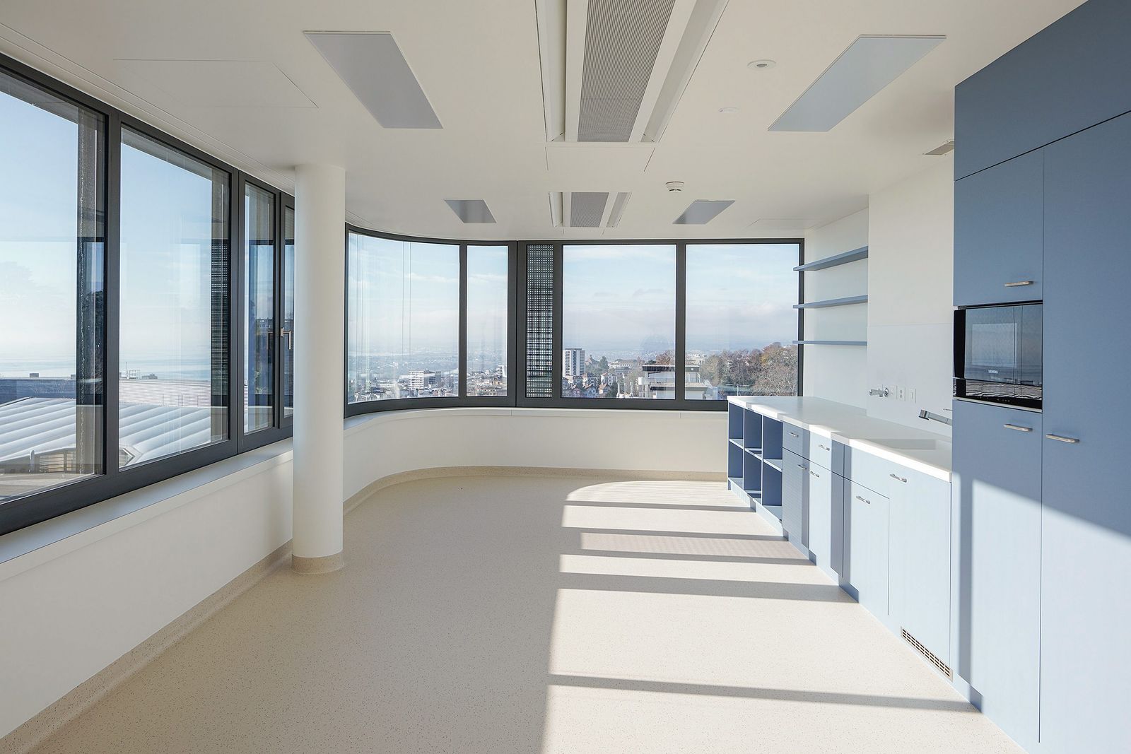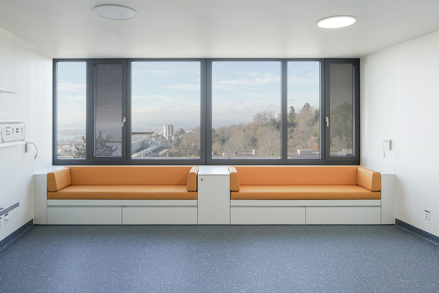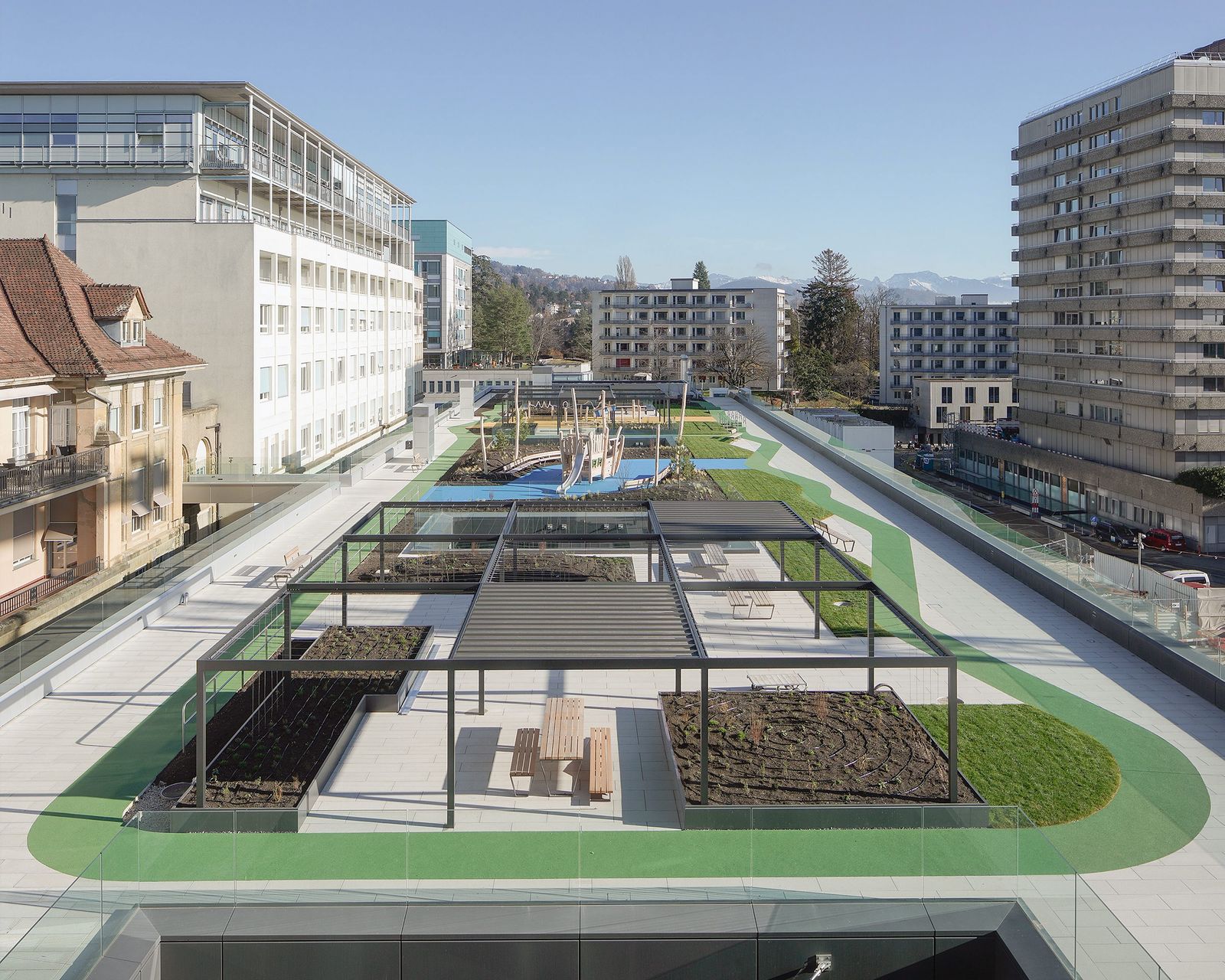 The new children's hospital is located in the centre of Lausanne University Hospital (CHUV). It has 71 inpatient beds in a setting designed especially for 0-18 year olds and their families. The hospital is characterised by its striking silhouette. The prominent urban corner at the junction of Rue du Bugnon and Esplanade is highlighted by a six-storey building. It houses both the main entrance to the paediatric hospital and access to an integrated metro station. The eastern section of the 180-meter-long building is terraced lower to preserve sightlines to and from the maternity clinic to the north. An important element of the concept is the rooftop garden on the lower part of the building, designed as a green oasis. Serving both as a therapy and rehabilitation space, it supports the well-being and recovery of young patients. As children are usually accompanied when they come to the hospital, the project prioritizes a family-friendly design. The patient rooms are designed to accommodate two children and their parents, with a modular layout that can be adapted to different space requirements.