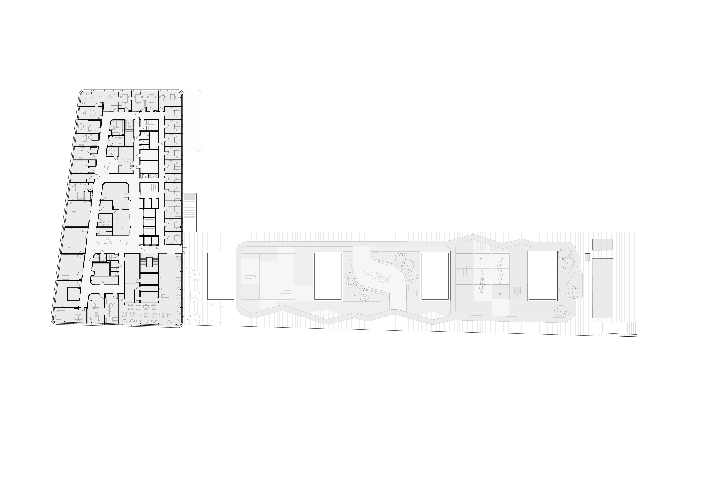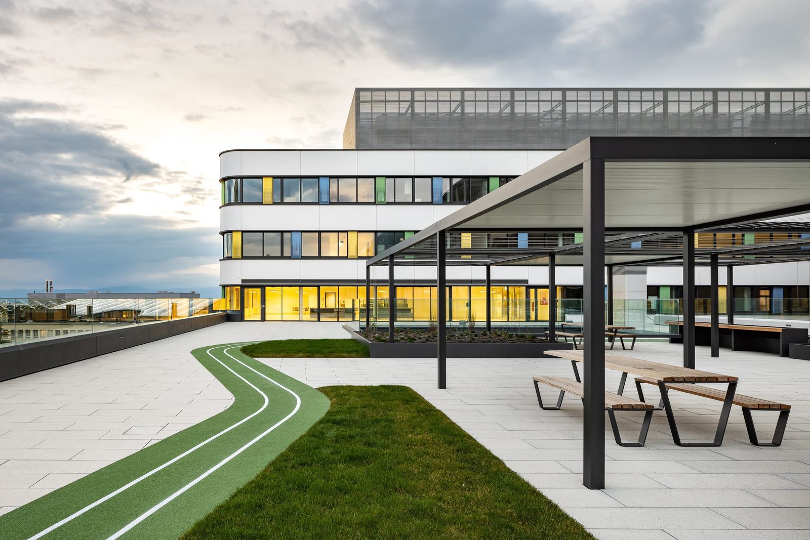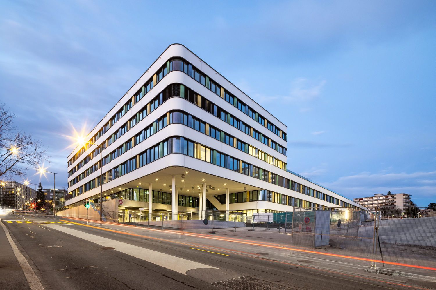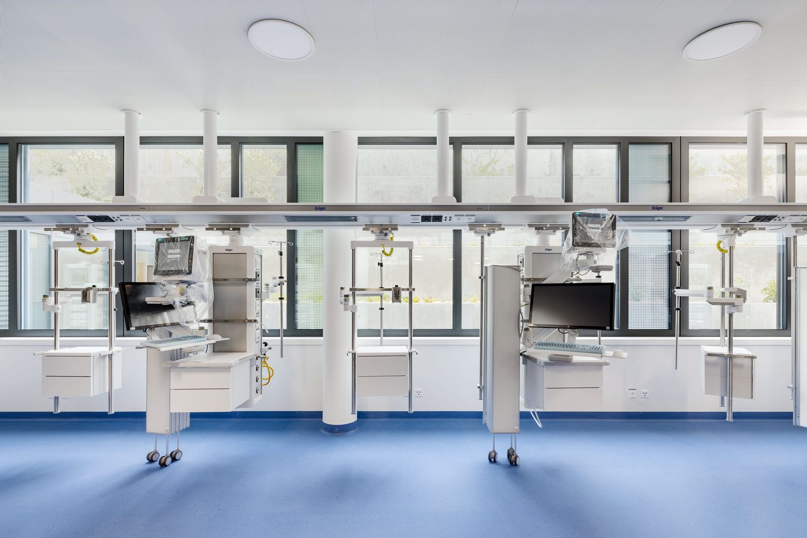 The new children's hospital is located in the centre of Lausanne University Hospital (CHUV). It has 71 inpatient beds in a setting designed especially for 0-18 year olds and their families. The hospital is characterised by its striking silhouette. The prominent urban corner at the junction of Rue du Bugnon and Esplanade is highlighted by a six-storey building. It houses both the main entrance to the paediatric hospital and access to an integrated metro station. The eastern section of the 180-meter-long building is terraced lower to preserve sightlines to and from the maternity clinic to the north. An important element of the concept is the rooftop garden on the lower part of the building, designed as a green oasis. Serving both as a therapy and rehabilitation space, it supports the well-being and recovery of young patients. As children are usually accompanied when they come to the hospital, the project prioritizes a family-friendly design. The patient rooms are designed to accommodate two children and their parents, with a modular layout that can be adapted to different space requirements.